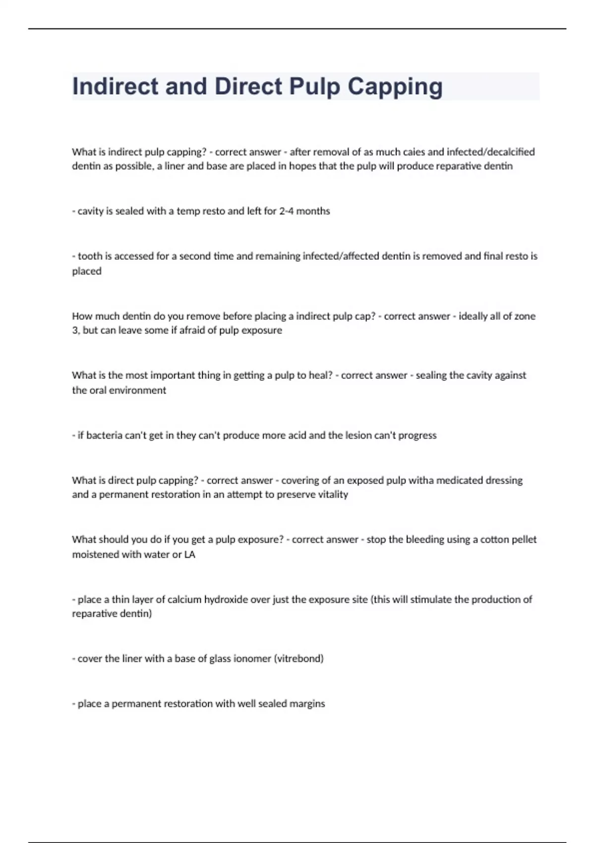 Indirect and Direct Pulp Capping What is indirect pulp capping? - correct answer - after removal of as much caies and infected/decalcified dentin as possible, a liner and base are placed in hopes that the pulp will produce reparative dentin - cavity is sealed with a temp resto and left for 2-4 months - tooth is accessed for a second time and remaining infected/affected dentin is removed and final resto is placed How much dentin do you remove before placing a indirect pulp cap? - correct answer - ideally all of zone 3, but can leave some if afraid of pulp exposure What is the most important thing in getting a pulp to heal? - correct answer - sealing the cavity against the oral environment - if bacteria can't get in they can't produce more acid and the lesion can't progress What is direct pulp capping? - correct answer - covering of an exposed pulp witha medicated dressing and a permanent restoration in an attempt to preserve vitality What should you do if you get a pulp exposure? - correct answer - stop the bleeding using a cotton pellet moistened with water or LA - place a thin layer of calcium hydroxide over just the exposure site (this will stimulate the production of reparative dentin) - cover the liner with a base of glass ionomer (vitrebond) - place a permanent restoration with well sealed margins
