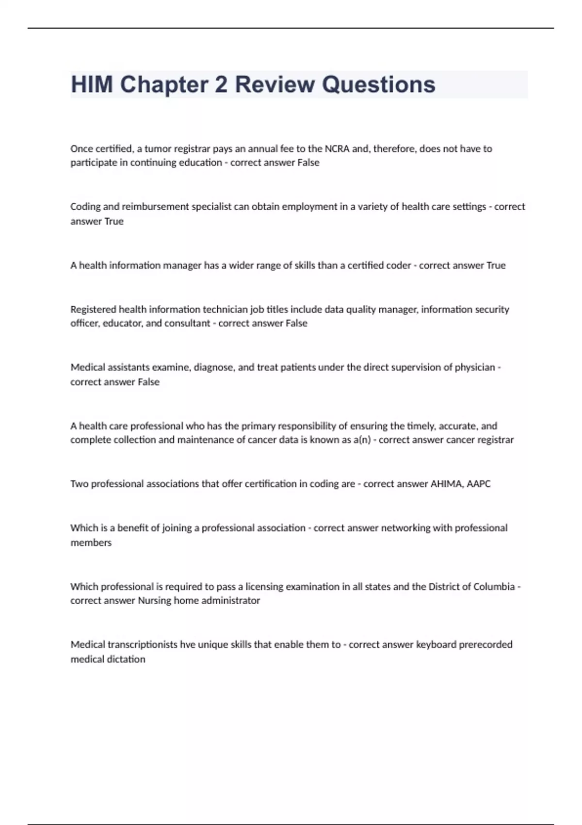 HIM Chapter 2 Review QuestionsOnce certified, a tumor registrar pays an annual fee to the NCRA and, therefore, does not have to participate in continuing education - correct answer False Coding and reimbursement specialist can obtain employment in a variety of health care settings - correct answer True A health information manager has a wider range of skills than a certified coder - correct answer True Registered health information technician job titles include data quality manager, information security officer, educator, and consultant - correct answer False Medical assistants examine, diagnose, and treat patients under the direct supervision of physician - correct answer False A health care professional who has the primary responsibility of ensuring the timely, accurate, and complete collection and maintenance of cancer data is known as a(n) - correct answer cancer registrar Two professional associations that offer certification in coding are - correct answer AHIMA, AAPC Which is a benefit of joining a professional association - correct answer networking with professional members Which professional is required to pass a licensing examination in all states and the District of Columbia - correct answer Nursing home administrator Medical transcriptionists hve unique skills that enable them to - correct answer keyboard prerecorded medical dictation The assignment of numbers to diagnoses, services, and procedures based on patient record documentation is known as __________ - correct answer coding The Bureau of Labor Statistics states that employment for the health information management profession is expected to grow ____________ for all occupations through 2022 - correct answer 22% The insurance claims organization that offers certification as a Certified Medical Billing Specialist is the - correct answer MAB The American Association of Medical Assistants credentials medical assistants as ___________, and the American Medical Technologists credentials medical assistants as ___________. - correct answer CMA, RMA Each professional association has a (n) ____________ which are judgments about what is right or wrong - correct answer Ethic Sally Smith is intreseted in pursuing a career as a physician office coder. What is the most appropriate coding certification for her to obtain? - correct answer CC-SP How has Internet-base technology allowed coding specialist to work at home? - correct answer The employer works together with a partner with an Internet-based application service provider (ASP). According to the American Health Information Management Association, health information managers have specific areas of expertise. State the areas of expertise of health information managers. - correct answer HIM expertise are managing the patient medical records, health information, administering computer information systems and coding diagnoses and procedures for health care services provided to patients.