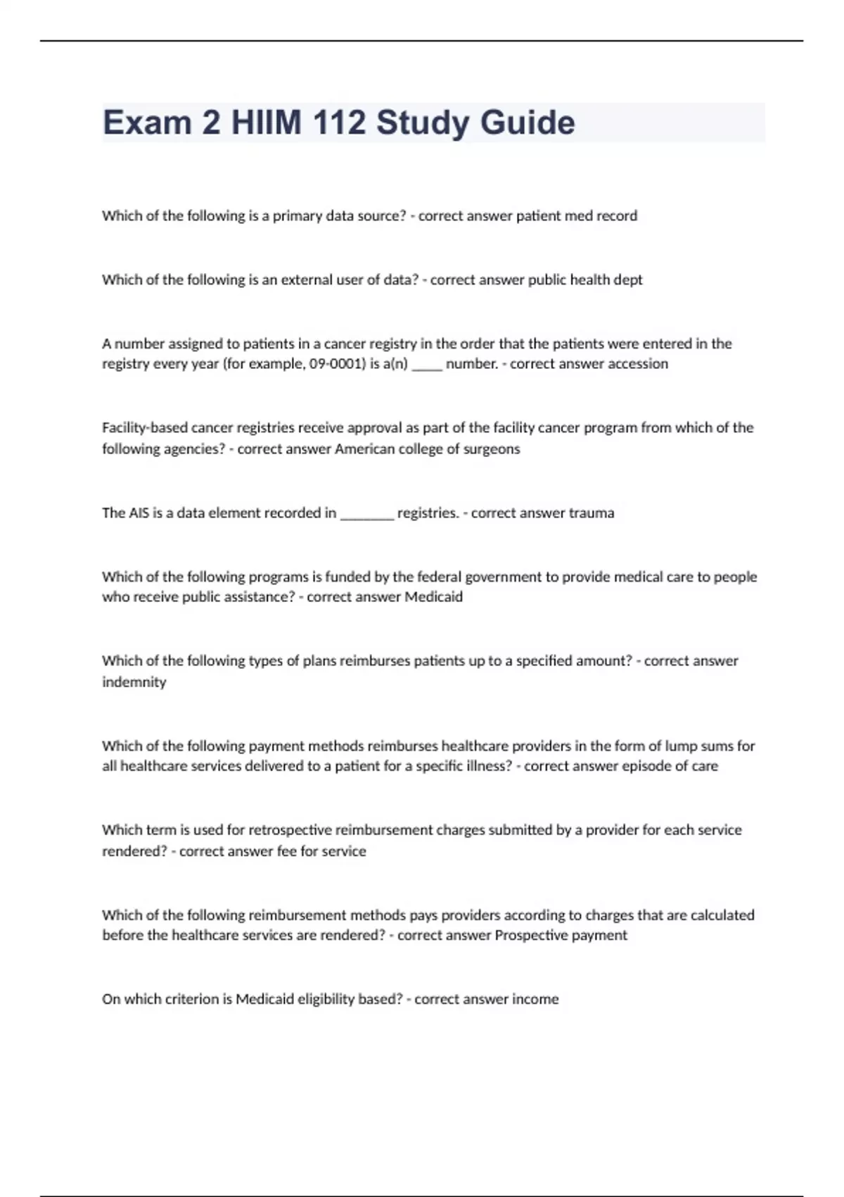 Exam 2 HIIM 112 Study GuideWhich of the following is a primary data source? - correct answer patient med record Which of the following is an external user of data? - correct answer public health dept A number assigned to patients in a cancer registry in the order that the patients were entered in the registry every year (for example, 09-0001) is a(n) ____ number. - correct answer accession Facility-based cancer registries receive approval as part of the facility cancer program from which of the following agencies? - correct answer American college of surgeons The AIS is a data element recorded in _______ registries. - correct answer trauma Which of the following programs is funded by the federal government to provide medical care to people who receive public assistance? - correct answer Medicaid Which of the following types of plans reimburses patients up to a specified amount? - correct answer indemnity Which of the following payment methods reimburses healthcare providers in the form of lump sums for all healthcare services delivered to a patient for a specific illness? - correct answer episode of care Which term is used for retrospective reimbursement charges submitted by a provider for each service rendered? - correct answer fee for service Which of the following reimbursement methods pays providers according to charges that are calculated before the healthcare services are rendered? - correct answer Prospective payment On which criterion is Medicaid eligibility based? - correct answer income