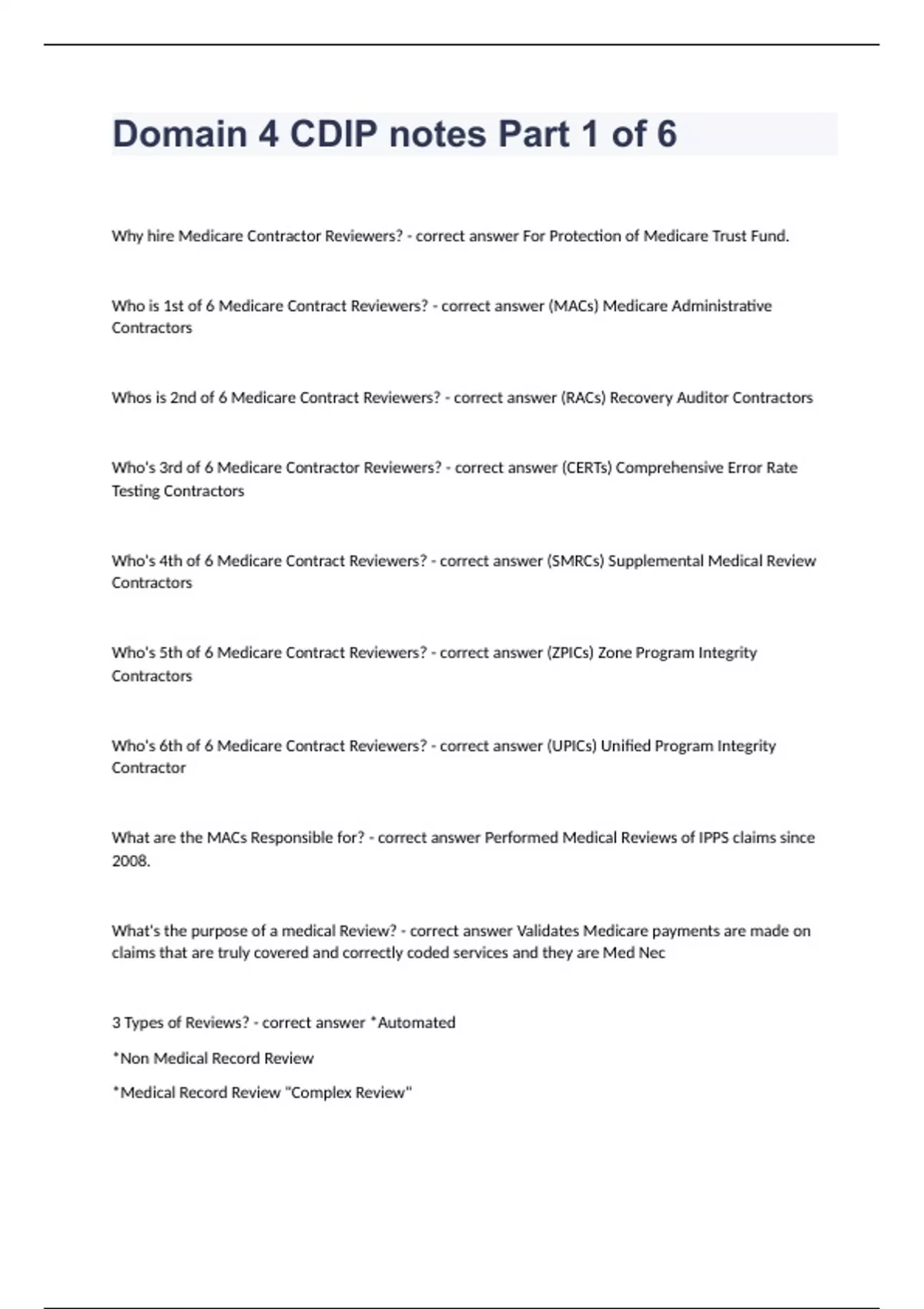 Domain 4 CDIP notes Part 1 of 6Why hire Medicare Contractor Reviewers? - correct answer For Protection of Medicare Trust Fund. Who is 1st of 6 Medicare Contract Reviewers? - correct answer (MACs) Medicare Administrative Contractors Whos is 2nd of 6 Medicare Contract Reviewers? - correct answer (RACs) Recovery Auditor Contractors Who's 3rd of 6 Medicare Contractor Reviewers? - correct answer (CERTs) Comprehensive Error Rate Testing Contractors Who's 4th of 6 Medicare Contract Reviewers? - correct answer (SMRCs) Supplemental Medical Review Contractors Who's 5th of 6 Medicare Contract Reviewers? - correct answer (ZPICs) Zone Program Integrity Contractors Who's 6th of 6 Medicare Contract Reviewers? - correct answer (UPICs) Unified Program Integrity Contractor What are the MACs Responsible for? - correct answer Performed Medical Reviews of IPPS claims since 2008. What's the purpose of a medical Review? - correct answer Validates Medicare payments are made on claims that are truly covered and correctly coded services and they are Med Nec 3 Types of Reviews? - correct answer *Automated *Non Medical Record Review *Medical Record Review "Complex Review"
