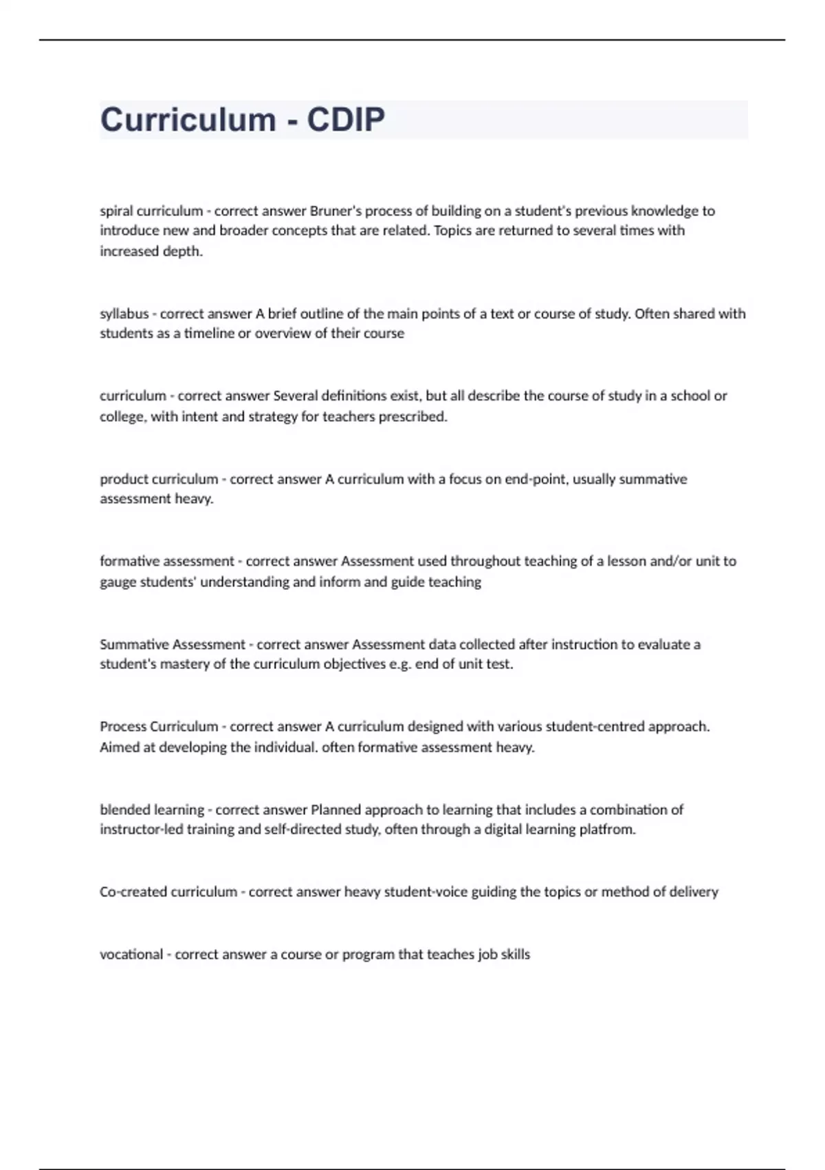 Curriculum - CDIP.spiral curriculum - correct answer Bruner's process of building on a student's previous knowledge to introduce new and broader concepts that are related. Topics are returned to several times with increased depth. syllabus - correct answer A brief outline of the main points of a text or course of study. Often shared with students as a timeline or overview of their course curriculum - correct answer Several definitions exist, but all describe the course of study in a school or college, with intent and strategy for teachers prescribed. product curriculum - correct answer A curriculum with a focus on end-point, usually summative assessment heavy. formative assessment - correct answer Assessment used throughout teaching of a lesson and/or unit to gauge students' understanding and inform and guide teaching Summative Assessment - correct answer Assessment data collected after instruction to evaluate a student's mastery of the curriculum objectives e.g. end of unit test. Process Curriculum - correct answer A curriculum designed with various student-centred approach. Aimed at developing the individual. often formative assessment heavy. blended learning - correct answer Planned approach to learning that includes a combination of instructor-led training and self-directed study, often through a digital learning platfrom. Co-created curriculum - correct answer heavy student-voice guiding the topics or method of delivery vocational - correct answer a course or program that teaches job skills