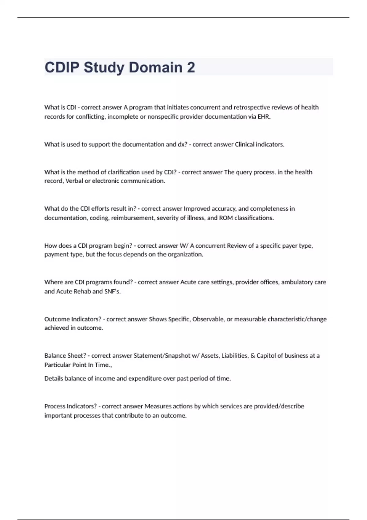CDIP Study Domain 2What is CDI - correct answer A program that initiates concurrent and retrospective reviews of health records for conflicting, incomplete or nonspecific provider documentation via EHR. What is used to support the documentation and dx? - correct answer Clinical indicators. What is the method of clarification used by CDI? - correct answer The query process. in the health record, Verbal or electronic communication. What do the CDI efforts result in? - correct answer Improved accuracy, and completeness in documentation, coding, reimbursement, severity of illness, and ROM classifications. How does a CDI program begin? - correct answer W/ A concurrent Review of a specific payer type, payment type, but the focus depends on the organization. Where are CDI programs found? - correct answer Acute care settings, provider offices, ambulatory care and Acute Rehab and SNF's. Outcome Indicators? - correct answer Shows Specific, Observable, or measurable characteristic/change achieved in outcome. Balance Sheet? - correct answer Statement/Snapshot w/ Assets, Liabilities, & Capitol of business at a Particular Point In Time., Details balance of income and expenditure over past period of time. Process Indicators? - correct answer Measures actions by which services are provided/describe important processes that contribute to an outcome.