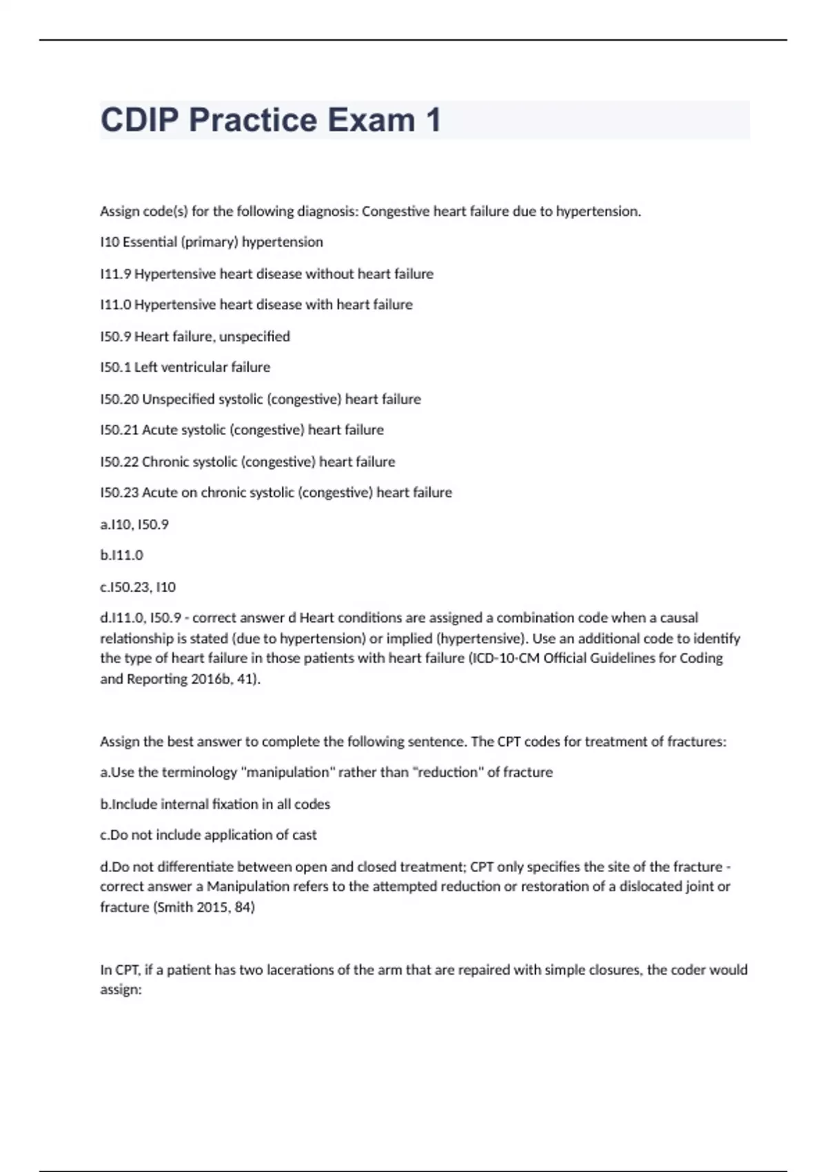 CDIP Practice Exam 1Assign code(s) for the following diagnosis: Congestive heart failure due to hypertension. I10 Essential (primary) hypertension I11.9 Hypertensive heart disease without heart failure I11.0 Hypertensive heart disease with heart failure I50.9 Heart failure, unspecified I50.1 Left ventricular failure I50.20 Unspecified systolic (congestive) heart failure I50.21 Acute systolic (congestive) heart failure I50.22 Chronic systolic (congestive) heart failure I50.23 Acute on chronic systolic (congestive) heart failure a.I10, I50.9 b.I11.0 c.I50.23, I10 d.I11.0, I50.9 - correct answer d Heart conditions are assigned a combination code when a causal relationship is stated (due to hypertension) or implied (hypertensive). Use an additional code to identify the type of heart failure in those patients with heart failure (ICD-10-CM Official Guidelines for Coding and Reporting 2016b, 41). Assign the best answer to complete the following sentence. The CPT codes for treatment of fractures: a.Use the terminology "manipulation" rather than "reduction" of fracture b.Include internal fixation in all codes c.Do not include application of cast d.Do not differentiate between open and closed treatment; CPT only specifies the site of the fracture - correct answer a Manipulation refers to the attempted reduction or restoration of a dislocated joint or fracture (Smith 2015, 84) In CPT, if a patient has two lacerations of the arm that are repaired with simple closures, the coder would assign:
