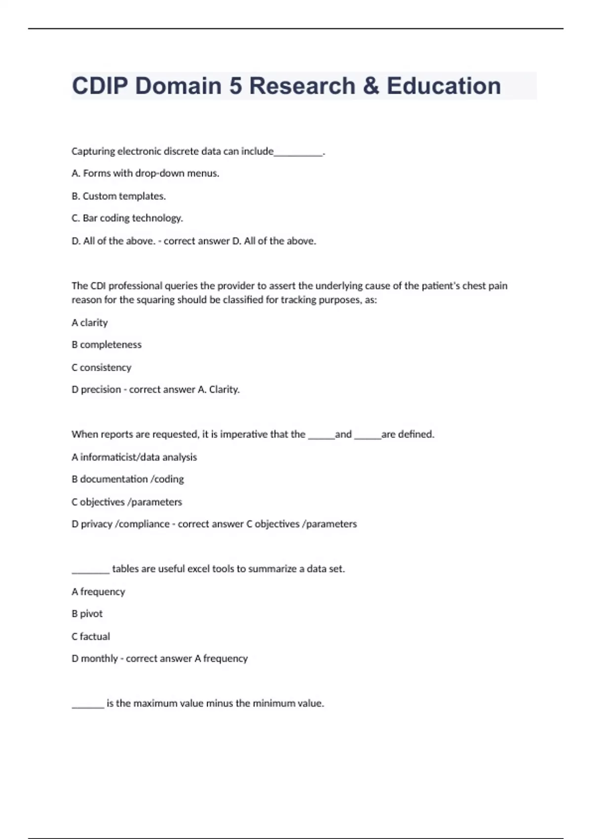 CDIP Domain 5 Research & Education Capturing electronic discrete data can include_________. A. Forms with drop-down menus. B. Custom templates. C. Bar coding technology. D. All of the above. - correct answer D. All of the above. The CDI professional queries the provider to assert the underlying cause of the patient's chest pain reason for the squaring should be classified for tracking purposes, as: A clarity B completeness C consistency D precision - correct answer A. Clarity. When reports are requested, it is imperative that the _____and _____are defined. A informaticist/data analysis B documentation /coding C objectives /parameters D privacy /compliance - correct answer C objectives /parameters _______ tables are useful excel tools to summarize a data set. A frequency B pivot C factual D monthly - correct answer A frequency ______ is the maximum value minus the minimum value. A mode B median C range D mean - correct answer C Range Which of the following is part of the report data validation process? A identify data source B documentation, queries C escalation procedure review D communication, process validation - correct answer A identify data source Which of the following would be an example of a CDI best practice resource? A AHIMA practice brief B Wikipedia C newsletter D CDI blog - correct answer A AHIMA practice brief Accurate documentation and code, assignment impacts, which of the following? A research B quality of care being provided C nursing care plans D patient therapy - correct answer A. Research. Which of the following is a key component of a compliance CDI program? A medical necessity audits B defined query procedures C core measure training D provider, corrective action plan - correct answer B defined query procedure ______ is the value with the highest frequency. A mean B mode C median