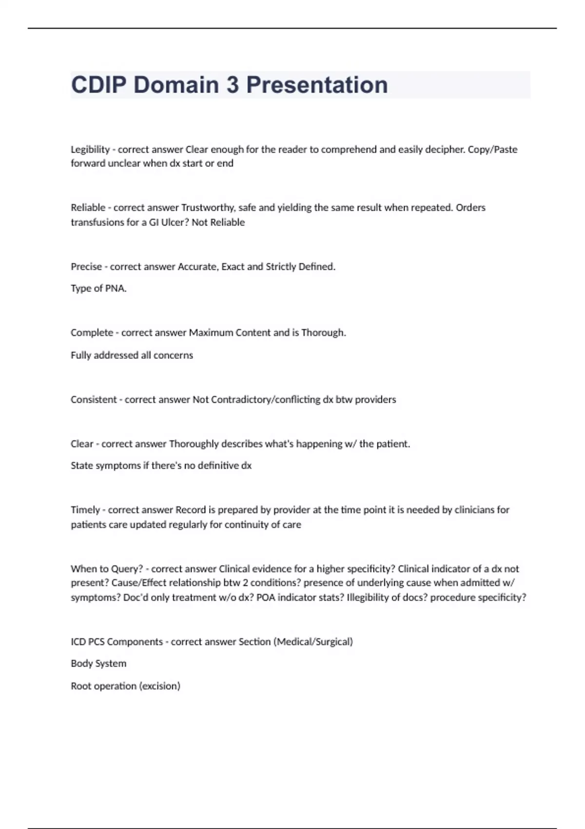 CDIP Domain 3 PresentationLegibility - correct answer Clear enough for the reader to comprehend and easily decipher. Copy/Paste forward unclear when dx start or end Reliable - correct answer Trustworthy, safe and yielding the same result when repeated. Orders transfusions for a GI Ulcer? Not Reliable Precise - correct answer Accurate, Exact and Strictly Defined. Type of PNA. Complete - correct answer Maximum Content and is Thorough. Fully addressed all concerns Consistent - correct answer Not Contradictory/conflicting dx btw providers Clear - correct answer Thoroughly describes what's happening w/ the patient. State symptoms if there's no definitive dx Timely - correct answer Record is prepared by provider at the time point it is needed by clinicians for patients care updated regularly for continuity of care When to Query? - correct answer Clinical evidence for a higher specificity? Clinical indicator of a dx not present? Cause/Effect relationship btw 2 conditions? presence of underlying cause when admitted w/ symptoms? Doc'd only treatment w/o dx? POA indicator stats? Illegibility of docs? procedure specificity? ICD PCS Components - correct answer Section (Medical/Surgical) Body System Root operation (excision)