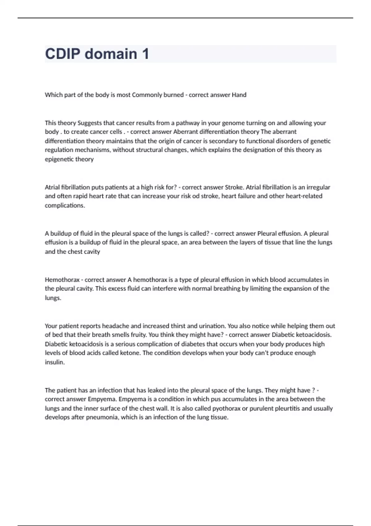 CDIP domain Which part of the body is most Commonly burned - correct answer Hand This theory Suggests that cancer results from a pathway in your genome turning on and allowing your body . to create cancer cells . - correct answer Aberrant differentiation theory The aberrant differentiation theory maintains that the origin of cancer is secondary to functional disorders of genetic regulation mechanisms, without structural changes, which explains the designation of this theory as epigenetic theory Atrial fibrillation puts patients at a high risk for? - correct answer Stroke. Atrial fibrillation is an irregular and often rapid heart rate that can increase your risk od stroke, heart failure and other heart-related complications. A buildup of fluid in the pleural space of the lungs is called? - correct answer Pleural effusion. A pleural effusion is a buildup of fluid in the pleural space, an area between the layers of tissue that line the lungs and the chest cavity Hemothorax - correct answer A hemothorax is a type of pleural effusion in which blood accumulates in the pleural cavity. This excess fluid can interfere with normal breathing by limiting the expansion of the lungs. Your patient reports headache and increased thirst and urination. You also notice while helping them out of bed that their breath smells fruity. You think they might have? - correct answer Diabetic ketoacidosis. Diabetic ketoacidosis is a serious complication of diabetes that occurs when your body produces high levels of blood acids called ketone. The condition develops when your body can't produce enough insulin. The patient has an infection that has leaked into the pleural space of the lungs. They might have ? - correct answer Empyema. Empyema is a condition in which pus accumulates in the area between the lungs and the inner surface of the chest wall. It is also called pyothorax or purulent pleurtitis and usually develops after pneumonia, which is an infection of the lung tissue.