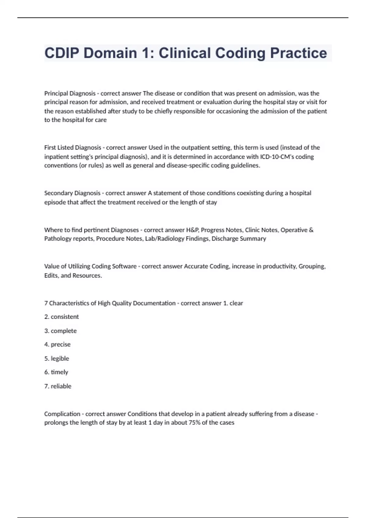 CDIP Domain 1 Clinical Coding PracticePrincipal Diagnosis - correct answer The disease or condition that was present on admission, was the principal reason for admission, and received treatment or evaluation during the hospital stay or visit for the reason established after study to be chiefly responsible for occasioning the admission of the patient to the hospital for care First Listed Diagnosis - correct answer Used in the outpatient setting, this term is used (instead of the inpatient setting's principal diagnosis), and it is determined in accordance with ICD-10-CM's coding conventions (or rules) as well as general and disease-specific coding guidelines. Secondary Diagnosis - correct answer A statement of those conditions coexisting during a hospital episode that affect the treatment received or the length of stay Where to find pertinent Diagnoses - correct answer H&P, Progress Notes, Clinic Notes, Operative & Pathology reports, Procedure Notes, Lab/Radiology Findings, Discharge Summary Value of Utilizing Coding Software - correct answer Accurate Coding, increase in productivity, Grouping, Edits, and Resources. 7 Characteristics of High Quality Documentation - correct answer 1. clear 2. consistent 3. complete 4. precise 5. legible 6. timely 7. reliable Complication - correct answer Conditions that develop in a patient already suffering from a disease - prolongs the length of stay by at least 1 day in about 75% of the cases Comorbidity - correct answer a pre-existing condition which of its presence with the principal diagnosis will increase the length of stay by at least 1 day in 75% of the cases Medicare - correct answer CMS- Establish rules MS-DRG - is used for reimbursement Medicaid - correct answer is handle by individual states primary insurance - correct answer own rules and regulations per plan MS- DRG - correct answer Medicare Severity Diagnosis Related Group PPS (Prospective Payment System) - correct answer fixed payment scale/schedule based o your DRG, effected Medicare Part A, resulted in shorter hospital stays MS-DRG Reimbursement Calculation - correct answer MS-DRG Relative Weight X Hospital Specific Adjusted base rate = Payment APR - DRG - correct answer All Patient Refined Diagnosis-Related Group SOI - correct answer Severity of Illness ROM - correct answer Risk of Mortality APR-DRG Four Levels - correct answer 1. Minor 2. Moderate 3. Major