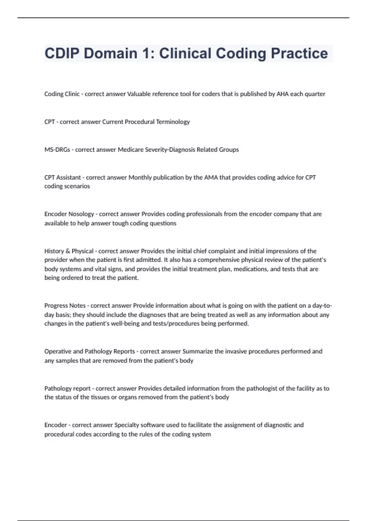 CDIP Domain 1 Clinical Coding PracticeCoding Clinic - correct answer Valuable reference tool for coders that is published by AHA each quarter CPT - correct answer Current Procedural Terminology MS-DRGs - correct answer Medicare Severity-Diagnosis Related Groups CPT Assistant - correct answer Monthly publication by the AMA that provides coding advice for CPT coding scenarios Encoder Nosology - correct answer Provides coding professionals from the encoder company that are available to help answer tough coding questions History & Physical - correct answer Provides the initial chief complaint and initial impressions of the provider when the patient is first admitted. It also has a comprehensive physical review of the patient's body systems and vital signs, and provides the initial treatment plan, medications, and tests that are being ordered to treat the patient. Progress Notes - correct answer Provide information about what is going on with the patient on a day-to-day basis; they should include the diagnoses that are being treated as well as any information about any changes in the patient's well-being and tests/procedures being performed. Operative and Pathology Reports - correct answer Summarize the invasive procedures performed and any samples that are removed from the patient's body Pathology report - correct answer Provides detailed information from the pathologist of the facility as to the status of the tissues or organs removed from the patient's body Encoder - correct answer Specialty software used to facilitate the assignment of diagnostic and procedural codes according to the rules of the coding system