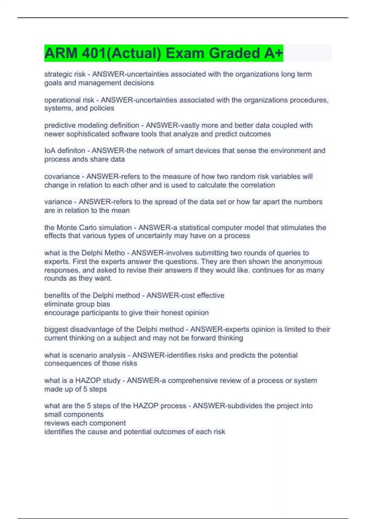 strategic risk - ANSWER-uncertainties associated with the organizations long term goals and management decisions operational risk - ANSWER-uncertainties associated with the organizations procedures, systems, and policies predictive modeling definition - ANSWER-vastly more and better data coupled with newer sophisticated software tools that analyze and predict outcomes IoA definiton - ANSWER-the network of smart devices that sense the environment and process ands share data covariance - ANSWER-refers to the measure of how two random risk variables will change in relation to each other and is used to calculate the correlation variance - ANSWER-refers to the spread of the data set or how far apart the numbers are in relation to the mean the Monte Carlo simulation - ANSWER-a statistical computer model that stimulates the effects that various types of uncertainty may have on a process what is the Delphi Metho - ANSWER-involves submitting two rounds of queries to experts. First the experts answer the questions. They are then shown the anonymous responses, and asked to revise their answers if they would like. continues for as many rounds as they want. benefits of the Delphi method - ANSWER-cost effective eliminate group bias encourage participants to give their honest opinion biggest disadvantage of the Delphi method - ANSWER-experts opinion is limited to their current thinking on a subject and may not be forward thinking what is scenario analysis - ANSWER-identifies risks and predicts the potential consequences of those risks what is a HAZOP study - ANSWER-a comprehensive review of a process or system made up of 5 steps what are the 5 steps of the HAZOP process - ANSWER-subdivides the project into small components reviews each component identifies the cause and potential outcomes of each risk