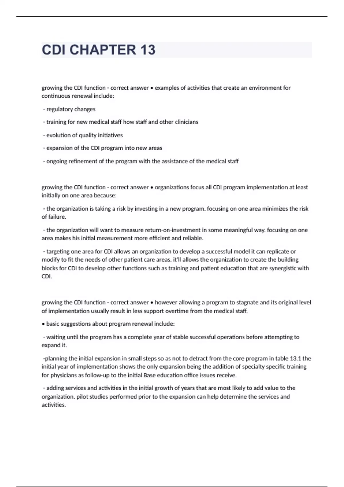 CDI CHAPTER 13growing the CDI function - correct answer • examples of activities that create an environment for continuous renewal include: - regulatory changes - training for new medical staff how staff and other clinicians - evolution of quality initiatives - expansion of the CDI program into new areas - ongoing refinement of the program with the assistance of the medical staff growing the CDI function - correct answer • organizations focus all CDI program implementation at least initially on one area because: - the organization is taking a risk by investing in a new program. focusing on one area minimizes the risk of failure. - the organization will want to measure return-on-investment in some meaningful way. focusing on one area makes his initial measurement more efficient and reliable. - targeting one area for CDI allows an organization to develop a successful model it can replicate or modify to fit the needs of other patient care areas. it'll allows the organization to create the building blocks for CDI to develop other functions such as training and patient education that are synergistic with CDI. growing the CDI function - correct answer • however allowing a program to stagnate and its original level of implementation usually result in less support overtime from the medical staff. • basic suggestions about program renewal include: - waiting until the program has a complete year of stable successful operations before attempting to expand it. -planning the initial expansion in small steps so as not to detract from the core program in table 13.1 the initial year of implementation shows the only expansion being the addition of specialty specific training for physicians as follow-up to the initial Base education office issues receive. - adding services and activities in the initial growth of years that are most likely to add value to the organization. pilot studies performed prior to the expansion can help determine the services and activities. - correct answer enlisting physician buy in - correct answer • initially the medical staff may not look forward to the mandatory documentation training sessions provided by the CDI function. • however it should be the goal of every CDI program to develop a rapport with the physician s so the that eventually the medical staff CDI as a valuable resource they can excess for their own benefit. • IT IS IMPORTANT TO POSITION THE CDI FUNCTION IN A WAY THAT THE PHYSICIANS VIEW THE SERVICES OFFERED BY THE CLINICAL DOCUMENTATION STAFF AS A VALUE-ADDED SERVICE FOR THEM. position CDI as value-added - correct answer • the following six activities are ways to develop a better understanding of how the CDI function can better serve physicians. - obtain feedback from physicians - listen and observe physicians - demonstrate how health record is common ground - provide web-based training and web-based resources - create code development opportunities - establish a clinical documentation advisory board and pay for their time providing specialty specific training following implementation - correct answer • after training office itions in baseline CDI education it is important to begin developing specialty specific training. • a physician CDI advisory board is the perfect place to begin creating the programs with the assistance of the physicians on the board • in creating the sessions CDI staff should obtain feedback from physicians in each specialty. • they should also consider using service specific patient records from the hospital in all educational programs. professional fee training - correct answer • training physicians about how their documentation in patient records affects their professional fee reimbursement is a key benefit to the physician. • training is a prime benefit to the hospital if it ditional physicians cooperate because they appreciate the hospital providing them with this information.