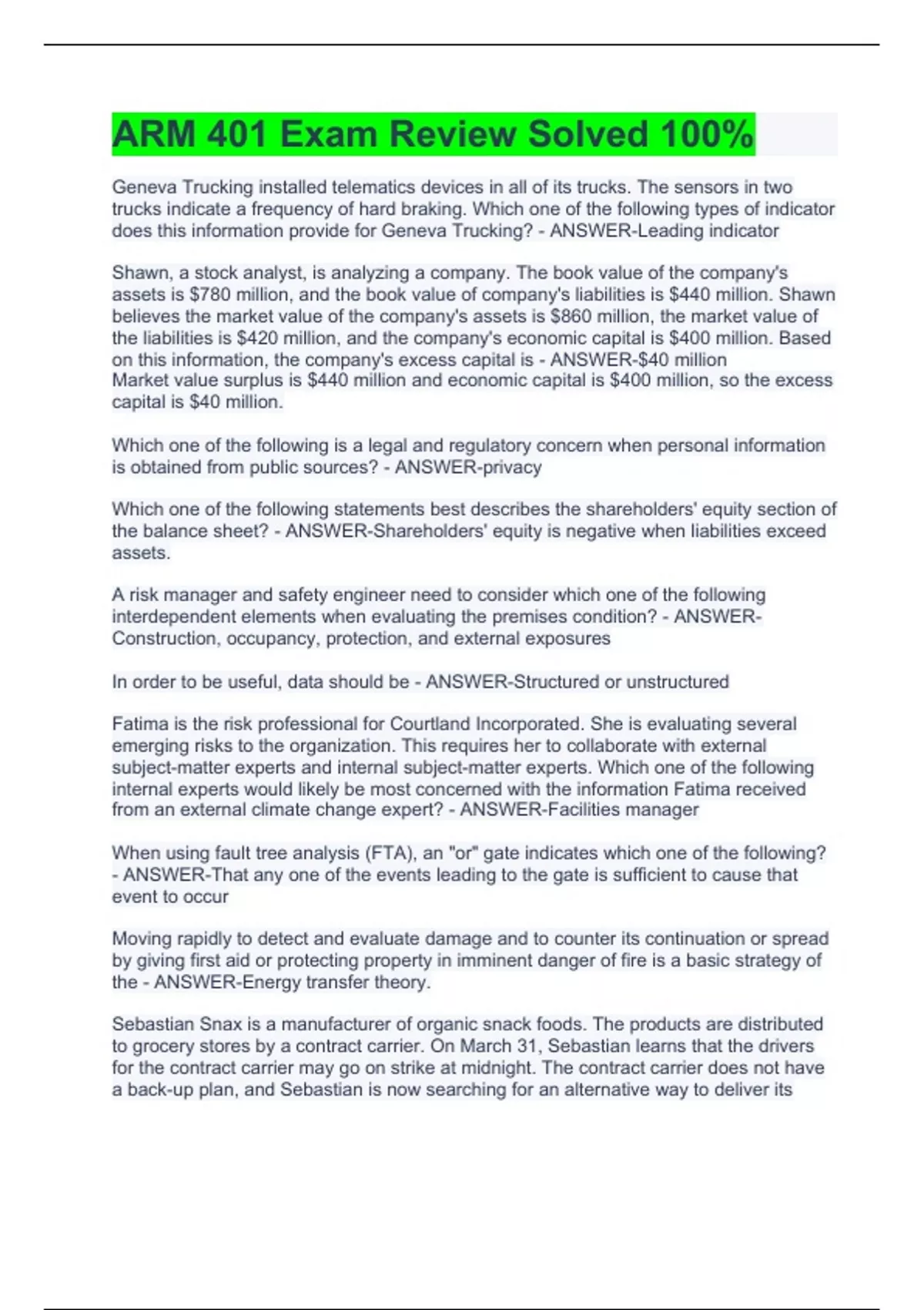 Geneva Trucking installed telematics devices in all of its trucks. The sensors in two trucks indicate a frequency of hard braking. Which one of the following types of indicator does this information provide for Geneva Trucking? - ANSWER-Leading indicator Shawn, a stock analyst, is analyzing a company. The book value of the company's assets is $780 million, and the book value of company's liabilities is $440 million. Shawn believes the market value of the company's assets is $860 million, the market value of the liabilities is $420 million, and the company's economic capital is $400 million. Based on this information, the company's excess capital is - ANSWER-$40 million Market value surplus is $440 million and economic capital is $400 million, so the excess capital is $40 million. Which one of the following is a legal and regulatory concern when personal information is obtained from public sources? - ANSWER-privacy Which one of the following statements best describes the shareholders' equity section of the balance sheet? - ANSWER-Shareholders' equity is negative when liabilities exceed assets. A risk manager and safety engineer need to consider which one of the following interdependent elements when evaluating the premises condition? - ANSWER-Construction, occupancy, protection, and external exposures In order to be useful, data should be - ANSWER-Structured or unstructured Fatima is the risk professional for Courtland Incorporated. She is evaluating several emerging risks to the organization. This requires her to collaborate with external subject-matter experts and internal subject-matter experts. Which one of the following internal experts would likely be most concerned with the information Fatima received from an external climate change expert? - ANSWER-Facilities manager When using fault tree analysis (FTA), an "or" gate indicates which one of the following? - ANSWER-That any one of the events leading to the gate is sufficient to cause that event to occur Moving rapidly to detect and evaluate damage and to counter its continuation or spread by giving first aid or protecting property in imminent danger of fire is a basic strategy of the - ANSWER-Energy transfer theory. Sebastian Snax is a manufacturer of organic snack foods. The products are distributed to grocery stores by a contract carrier. On March 31, Sebastian learns that the drivers for the contract carrier may go on strike at midnight. The contract carrier does not have a back-up plan, and Sebastian is now searching for an alternative way to deliver its