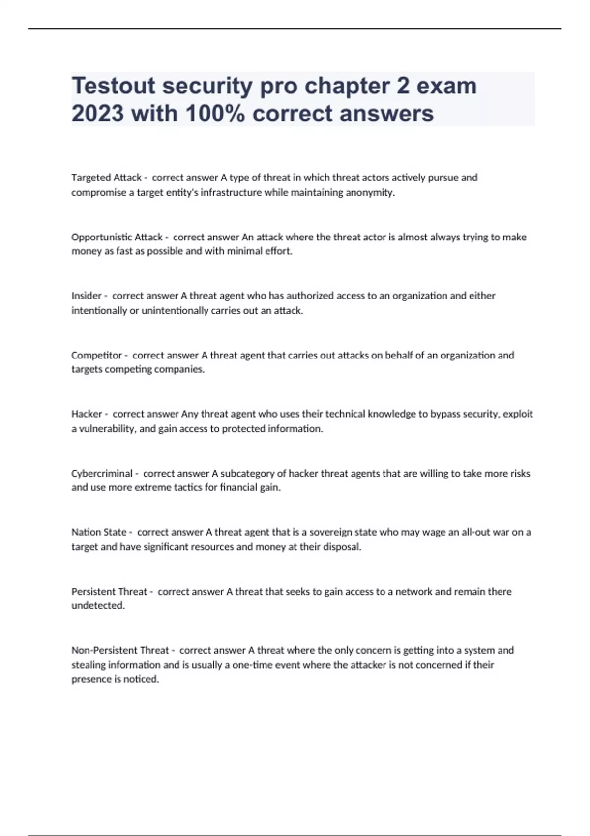 Targeted Attack - correct answer A type of threat in which threat actors actively pursue and compromise a target entity's infrastructure while maintaining anonymity. Opportunistic Attack - correct answer An attack where the threat actor is almost always trying to make money as fast as possible and with minimal effort. Insider - correct answer A threat agent who has authorized access to an organization and either intentionally or unintentionally carries out an attack. Competitor - correct answer A threat agent that carries out attacks on behalf of an organization and targets competing companies. Hacker - correct answer Any threat agent who uses their technical knowledge to bypass security, exploit a vulnerability, and gain access to protected information. Cybercriminal - correct answer A subcategory of hacker threat agents that are willing to take more risks and use more extreme tactics for financial gain. Nation State - correct answer A threat agent that is a sovereign state who may wage an all-out war on a target and have significant resources and money at their disposal. Persistent Threat - correct answer A threat that seeks to gain access to a network and remain there undetected. Non-Persistent Threat - correct answer A threat where the only concern is getting into a system and stealing information and is usually a one-time event where the attacker is not concerned if their presence is noticed. Internal threat - correct answer are authorized individuals that exploit their inherent privileges to carry out an attack. External threat - correct answer are any individuals or groups that attacks a network from the outside and seeks to gain unauthorized to data. Open Source Intelligence - correct answer is information that is readily available to the public and doesn't req