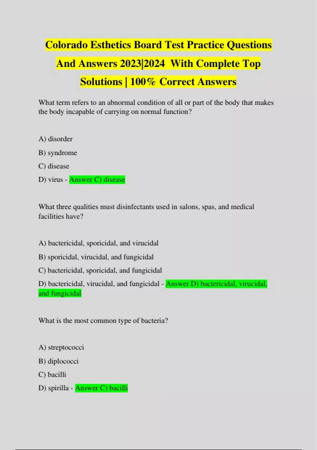 Colorado Esthetics Board Test Practice Questions And Answers 2023|2024 With Complete Top Solutions | 100% Correct Answers What term refers to an abnormal condition of all or part of the body that makes the body incapable of carrying on normal function? A) disorder B) syndrome C) disease D) virus - Answer C) disease What three qualities must disinfectants used in salons, spas, and medical facilities have? A) bactericidal, sporicidal, and virucidal B) sporicidal, virucidal, and fungicidal C) bactericidal, sporicidal, and fungicidal D) bactericidal, virucidal, and fungicidal - Answer D) bactericidal, virucidal, and fungicidal What is the most common type of bacteria? A) streptococci B) diplococci C) bacilli D) spirilla - Answer C) bacilli What is the most common way that communicable diseases spread? A) dirty hands B) coughing C) sneezing D) contaminated water - Answer A) dirty hands What is a sign that a client has human papilloma virus (HPV) or plantar warts? A) redness and swelling surrounding an open wound B) clusters of small black dots on the bottom of the foot C) splotchy skin on the cheeks, neck, and forehead D) areas of thickened skin and greenish specks around the nails - Answer B) clusters of small black dots on the bottom of the foot What is a type of fungus that affects plants or grows on inanimate objects, but does NOT cause human infections in the salon? A) mildew B) keratin C) onychomycosis D) dermophyte - Answer A) milde