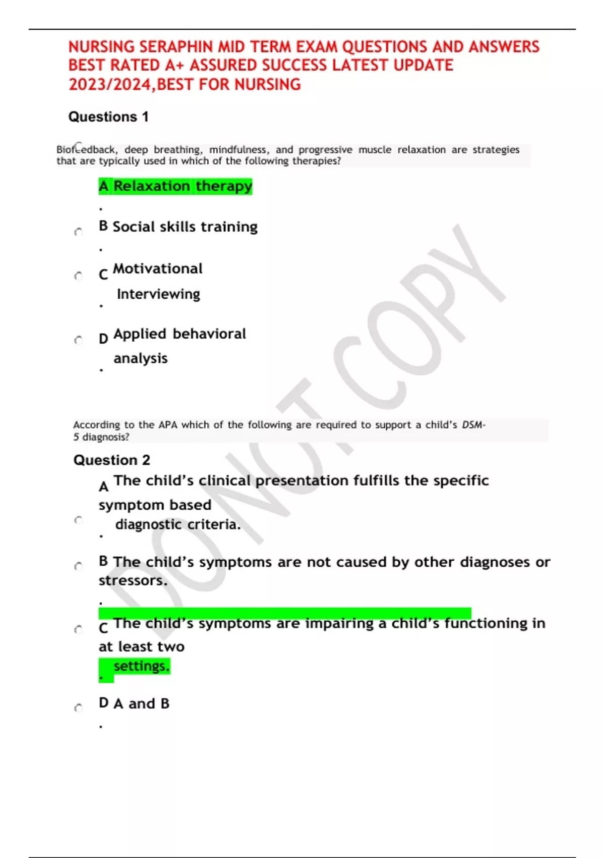 NURSING SERAPHIN MID TERM EXAM QUESTIONS AND ANSWERS BEST RATED A+ ASSURED SUCCESS LATEST UPDATE 2023/2024,BEST FOR NURSING