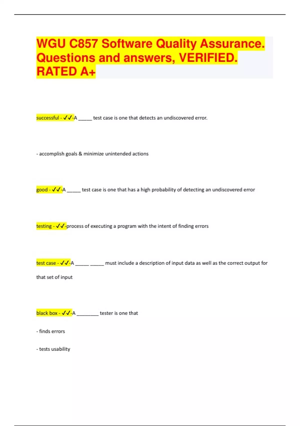 WGU C857 - Quiz & PA - Test Ready, Questions and answers, 100% Accurate. Verified. What can be achieved with a process improvement initiative based on the CMMI? - -A measurable business result Which type of review is considered a walkthrough? - -Peer review When is the appropriate time to include the people responsible for quality in the development cycle? - -As early as possible in the cycle What key best practice brings the development process together in order to meet the deliverable deadline? - -Having clearly defined goals for every milestone Which of the following is a key principle of testing? - -Complete testing is not possible Which test type will satisfy the final validation and verification criteria? - -Acceptance testing