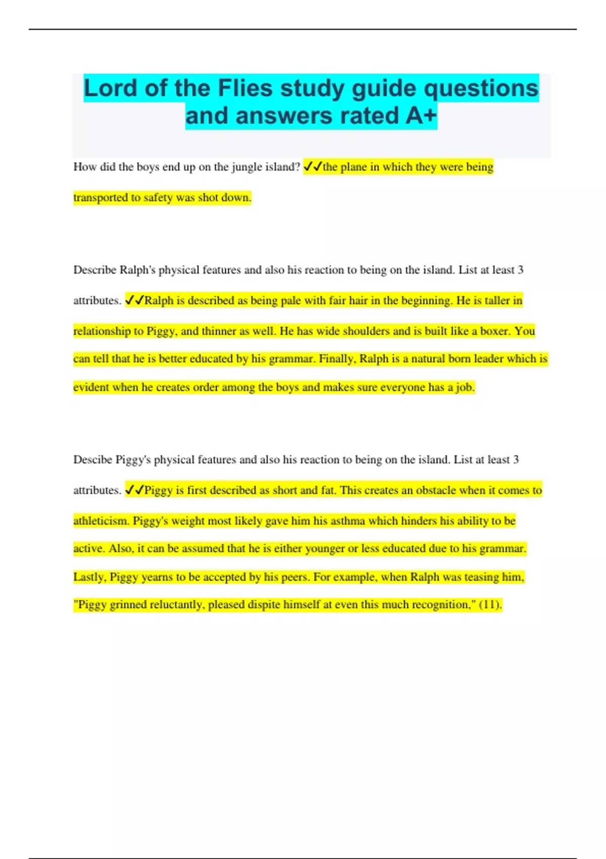 Lord of the Flies study guide questions and answers rated A+