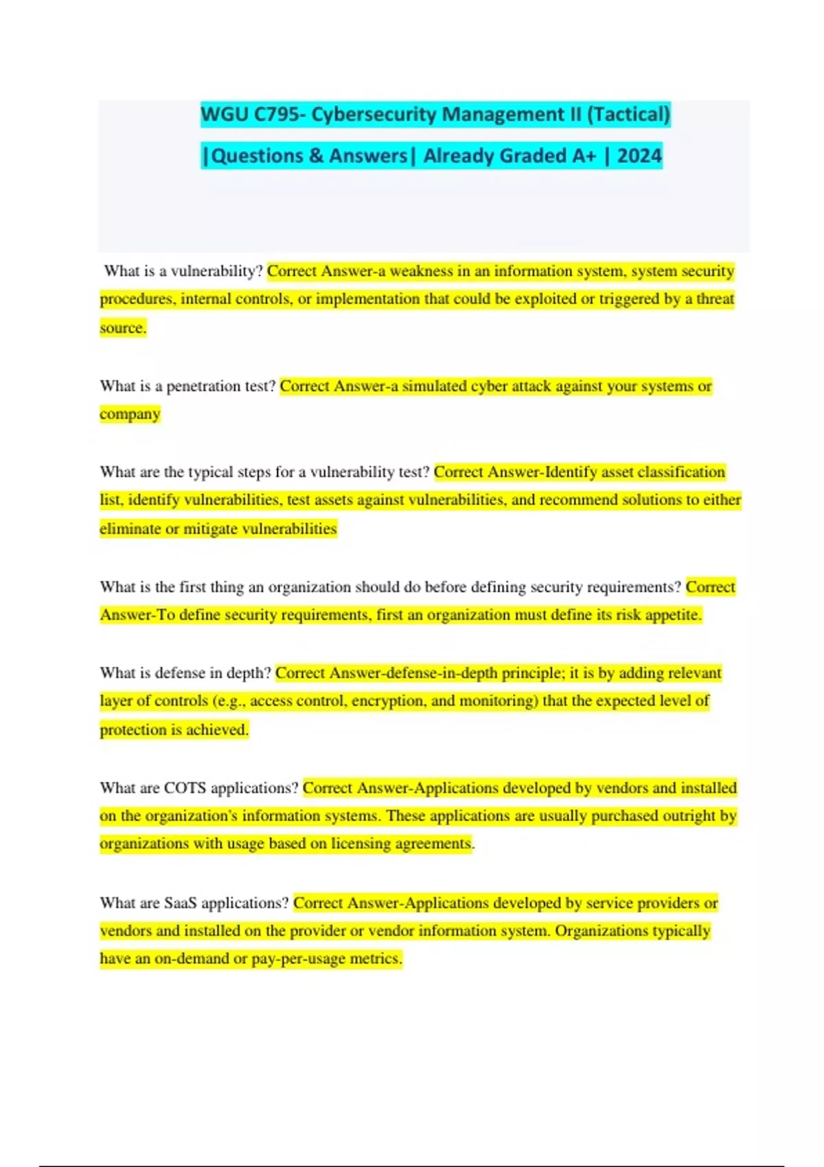 WGU C795- Cybersecurity Management II (Tactical) |Questions & Answers| Already Graded A+ | 2024 What is a vulnerability? Correct Answer-a weakness in an information system, system security procedures, internal controls, or implementation that could be exploited or triggered by a threat source. What is a penetration test? Correct Answer-a simulated cyber attack against your systems or company What are the typical steps for a vulnerability test? Correct Answer-Identify asset classification list, identify vulnerabilities, test assets against vulnerabilities, and recommend solutions to either eliminate or mitigate vulnerabilities What is the first thing an organization should do before defining security requirements? Correct Answer-To define security requirements, first an organization must define its risk appetite. What is defense in depth? Correct Answer-defense-in-depth principle; it is by adding relevant layer of controls (e.g., access control, encryption, and monitoring) that the expected level of protection is achieved. What are COTS applications? Correct Answer-Applications developed by vendors and installed on the organization's information systems. These applications are usually purchased outright by organizations with usage based on licensing agreements. What are SaaS applications? Correct Answer-Applications developed by service providers or vendors and installed on the provider or vendor information system. Organizations typically have an on-demand or pay-per-usage metrics