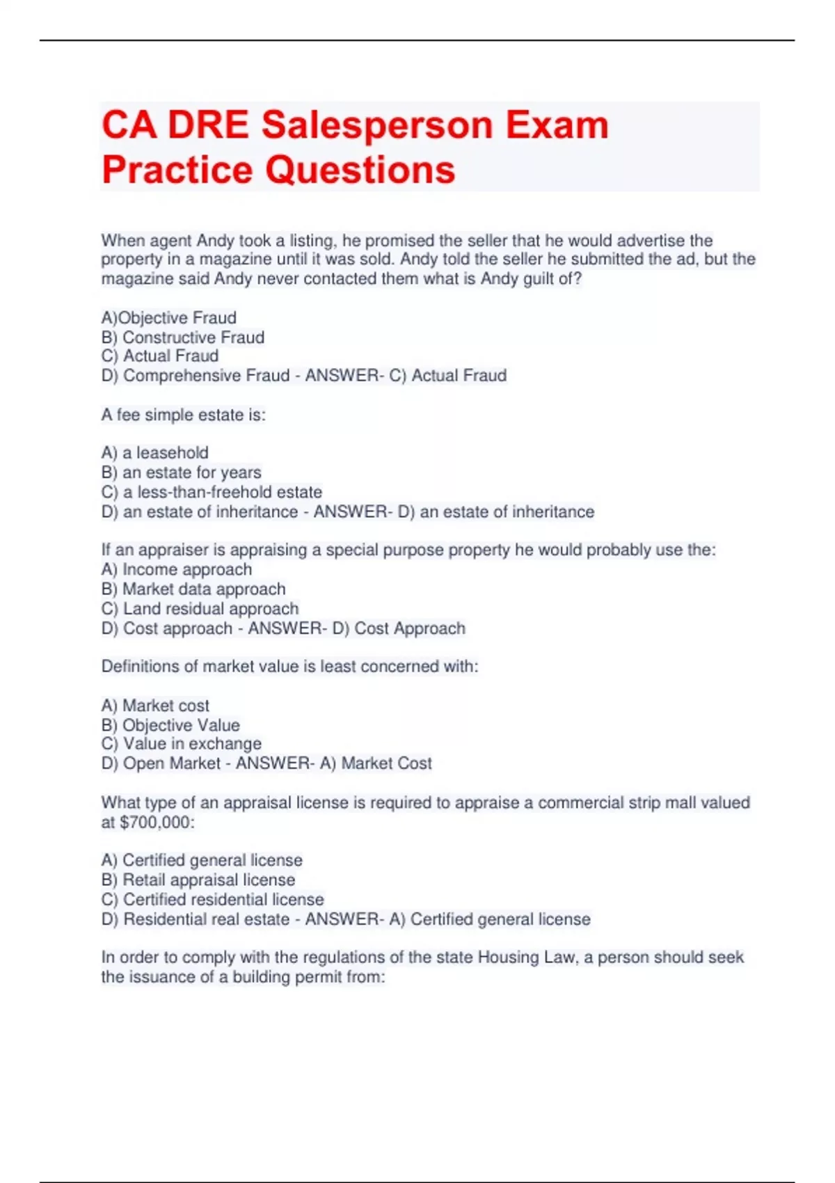 CA DRE Salesperson Exam Practice Questions When agent Andy took a listing, he promised the seller that he would advertise the property in a magazine until it was sold. Andy told the seller he submitted the ad, but the magazine said Andy never contacted them what is Andy guilt of? A)Objective Fraud B) Constructive Fraud C) Actual Fraud D) Comprehensive Fraud - ANSWER- C) Actual Fraud A fee simple estate is: A) a leasehold B) an estate for years C) a less-than-freehold estate D) an estate of inheritance - ANSWER- D) an estate of inheritance If an appraiser is appraising a special purpose property he would probably use the: A) Income approach B) Market data approach C) Land residual approach D) Cost approach - ANSWER- D) Cost Approach Definitions of market value is least concerned with: A) Market cost B) Objective Value C) Value in exchange D) Open Market - ANSWER- A) Market Cost What type of an appraisal license is required to appraise a commercial strip mall valued at $700,000: A) Certified general license B) Retail appraisal license C) Certified residential license D) Residential real estate - ANSWER- A) Certified general license In order to comply with the regulations of the state Housing Law, a person should seek the issuance of a building permit from: A) the California DRE B) the local Department of Building and Safety C) the nearest office of the Department of Housing and Community Development D) the California Department of Urban Renewal - ANSWER- B) the local Department of Building and Safety Property taxes are described as "ad valorem" taxes. "Ad valorem" most nearly means A) Replacement Value B) According to value C) Market value D) Reproduction value - ANSWER- B) According to value One of the main benefits of a sale-leaseback transaction would be: A) You can get the deposit back with no objection B) You have the option to lease the property back after the termination of the lease C) the ability of the seller to deduct all of his future rent payments as business expenditures D) the ability to maintain the book value of the new buyer - ANSWER- C) the ability of the seller to deduct all of his future rent payments as business expenditures The main purpose of "RESPA" (Real Estate Settlement Producers Act) is to: A) To provide consumers with enough info to enable them to shop for settlement services B)Place a fixed limit on settlement costs on residential property of four units or less C) To standardize settlement services throughout the US D) Place a fixed limit on settlement costs in all real estate transactions - ANSWER- A) To provide consumers with enough info to enable them to shop for settlement services A broker who holds a valid listing on a property places a classified ad for the property containing only the following information "For Sale: 3 bedroom, 2 bath home with swiiming pool. Asking price $165,00. Telephone 555-9276" This type of ad is a: A) Silent Ad B) Qualified Ad C) Display Ad D) Blind Ad - ANSWER- D) Blind Ad A property owner lists his property for sale with a broker. During the negotiations, the owner told the broker that the owner wanted $138,00 for the property, and anything above that amount the broker could keep as his commission. The listing with tis type of provision is known as: A) open listing B) gross listing C) non exclusive listing D) net listing - ANSWER- D) net listing Which of the following is an example of a less than freehold estate? A) estate in severalty B) fee simple determinable estate C) leasehold estate D) fee simple estate - ANSWER- C) leasehold estate When a lender loans a borrower 100% of the purchase price of a house, and the loan is not government-related, the lender would be best protected by: A) a downturn in the economy B) low monthly payments C) low interest rate D) appreciation - ANSWER- D) appreciation The term "warehousing" as used in real estate financing, means: A) The financing of industrial warehouse B) A mortgage company collection loans prior to resale C) A large bank or savings and loan D) Unregulated real estate loans - ANSWER- B) A mortgage company collection loans prior to resale When a lender makes a loan regulated by the Real Estate Settlement Procedures Act, the loan applicant must be provided with which of the following: A) An application for private mortgage insurance B) A loan estimate C) A bill of sale D) Forms for applying for the homeowners exemption - ANSWER- B) A loan of estimate