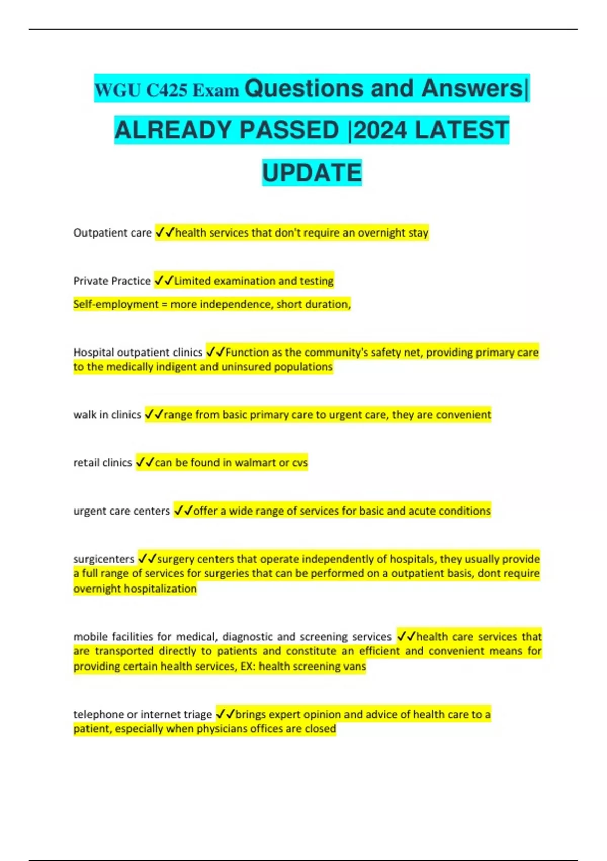 WGU C425 Exam Questions and Answers| ALREADY PASSED |2024 LATEST UPDATE Outpatient care health services that don't require an overnight stay Private Practice Limited examination and testing Self-employment = more independence, short duration, Hospital outpatient clinics Function as the community's safety net, providing primary care to the medically indigent and uninsured populations walk in clinics range from basic primary care to urgent care, they are convenient retail clinics can be found in walmart or cvs urgent care centers offer a wide range of services for basic and acute conditions surgicenters surgery centers that operate independently of hospitals, they usually provide a full range of services for surgeries that can be performed on a outpatient basis, dont require overnight hospitalization mobile facilities for medical, diagnostic and screening services health care services that are transported directly to patients and constitute an efficient and convenient means for providing certain health services, EX: health screening vans telephone or internet triage brings expert opinion and advice of health care to a patient, especially when physicians offices are closed
