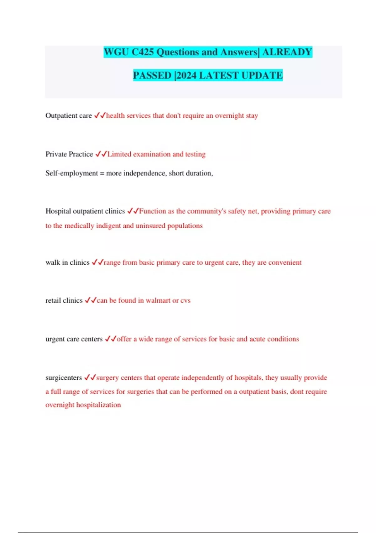 WGU C425 Questions and Answers| ALREADY PASSED |2024 LATEST UPDATE Outpatient care health services that don't require an overnight stay Private Practice Limited examination and testing Self-employment = more independence, short duration, Hospital outpatient clinics Function as the community's safety net, providing primary care to the medically indigent and uninsured populations walk in clinics range from basic primary care to urgent care, they are convenient retail clinics can be found in walmart or cvs urgent care centers offer a wide range of services for basic and acute conditions surgicenters surgery centers that operate independently of hospitals, they usually provide a full range of services for surgeries that can be performed on a outpatient basis, dont require overnight hospitalization