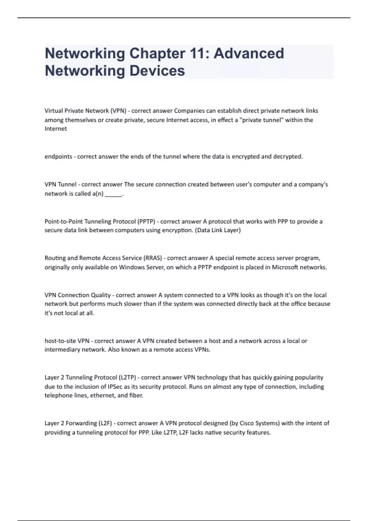 Networking Chapter 11 Advanced Networking Devices Virtual Private Network (VPN) - correct answer Companies can establish direct private network links among themselves or create private, secure Internet access, in effect a "private tunnel" within the Internet endpoints - correct answer the ends of the tunnel where the data is encrypted and decrypted. VPN Tunnel - correct answer The secure connection created between user's computer and a company's network is called a(n) _____. Point-to-Point Tunneling Protocol (PPTP) - correct answer A protocol that works with PPP to provide a secure data link between computers using encryption. (Data Link Layer) Routing and Remote Access Service (RRAS) - correct answer A special remote access server program, originally only available on Windows Server, on which a PPTP endpoint is placed in Microsoft networks. VPN Connection Quality - correct answer A system connected to a VPN looks as though it's on the local network but performs much slower than if the system was connected directly back at the office because it's not local at all. host-to-site VPN - correct answer A VPN created between a host and a network across a local or intermediary network. Also known as a remote access VPNs. Layer 2 Tunneling Protocol (L2TP) - correct answer VPN technology that has quickly gaining popularity due to the inclusion of IPSec as its security protocol. Runs on almost any type of connection, including telephone lines, ethernet, and fiber. Layer 2 Forwarding (L2F) - correct answer A VPN protocol designed (by Cisco Systems) with the intent of providing a tunneling protocol for PPP. Like L2TP, L2F lacks native security features. VPN concentrator - correct answer A device that aggregates hundreds or thousands of VPN connections. client-to-site VPN - correct answer Also known as a remote-access VPN, a client-to-site VPN interconnects a remote user with a site, as an alternative to dial-up or ISDN connectivity, at a reduced cost. site-to-site VPN - correct answer Interconnects two sites, as an alternative to a leased line, at a reduced cost. host-to-host VPN - correct answer A type of VPN in which two computers create a VPN tunnel directly between them. Both computers must have the appropriate software installed, and they can't serve as a gateway to other hosts on their respective networks. SSL VPN (Secure Socket Layer VPN) - correct answer A VPN format that works with a web browser (installing a separate client is not necessary); The two most common types of SSL VPNs are SSL portal VPNs and SSL tunnel VPNs. Datagram TLS (DTLS) - correct answer optimize connections for delay-sensitive applications, such as voice and video over a VPN. Uses UDP datagrams rather than TCP segments for communication. This enhances certain types of VPN traffic. Dynamic Multipoint VPN (DMVPN) - correct answer a Cisco software solution for building multiple VPNs in an easy, dynamic, and scalable manner; enables direct VPN connections between multiple locations directly. Also employs standard security (IPsec) to make all the connections secure from unwanted prying. IPSec VPN - correct answer a secure implementation of VPN with encryption Generic Routing Encapsulation (GRE) - correct answer A tunneling protocol designed to encapsulate a wide variety of network layer packets inside IP tunneling packets; paired with IPsec for encryption. You can use GRE to make a point-to-point tunnel connection that carries all sorts of traffic over Layer 3, including multicast and IPv6 traffic.