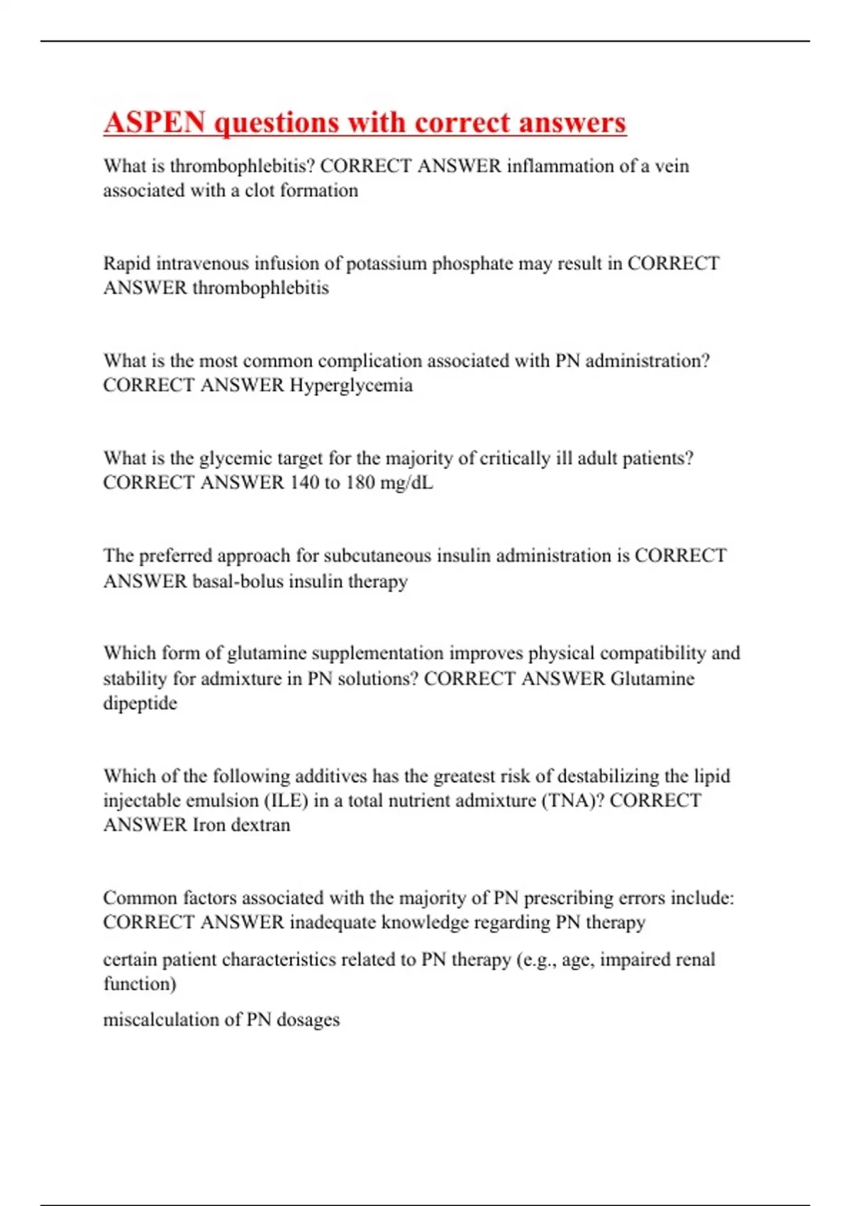 What is thrombophlebitis? CORRECT ANSWER inflammation of a vein associated with a clot formation Rapid intravenous infusion of potassium phosphate may result in CORRECT ANSWER thrombophlebitis What is the most common complication associated with PN administration? CORRECT ANSWER Hyperglycemia What is the glycemic target for the majority of critically ill adult patients? CORRECT ANSWER 140 to 180 mg/dL The preferred approach for subcutaneous insulin administration is CORRECT ANSWER basal-bolus insulin therapy Which form of glutamine supplementation improves physical compatibility and stability for admixture in PN solutions? CORRECT ANSWER Glutamine dipeptide Which of the following additives has the greatest risk of destabilizing the lipid injectable emulsion (ILE) in a total nutrient admixture (TNA)? CORRECT ANSWER Iron dextran Common factors associated with the majority of PN prescribing errors include: CORRECT ANSWER inadequate knowledge regarding PN therapy certain patient characteristics related to PN therapy (e.g., age, impaired renal function) miscalculation of PN dosages