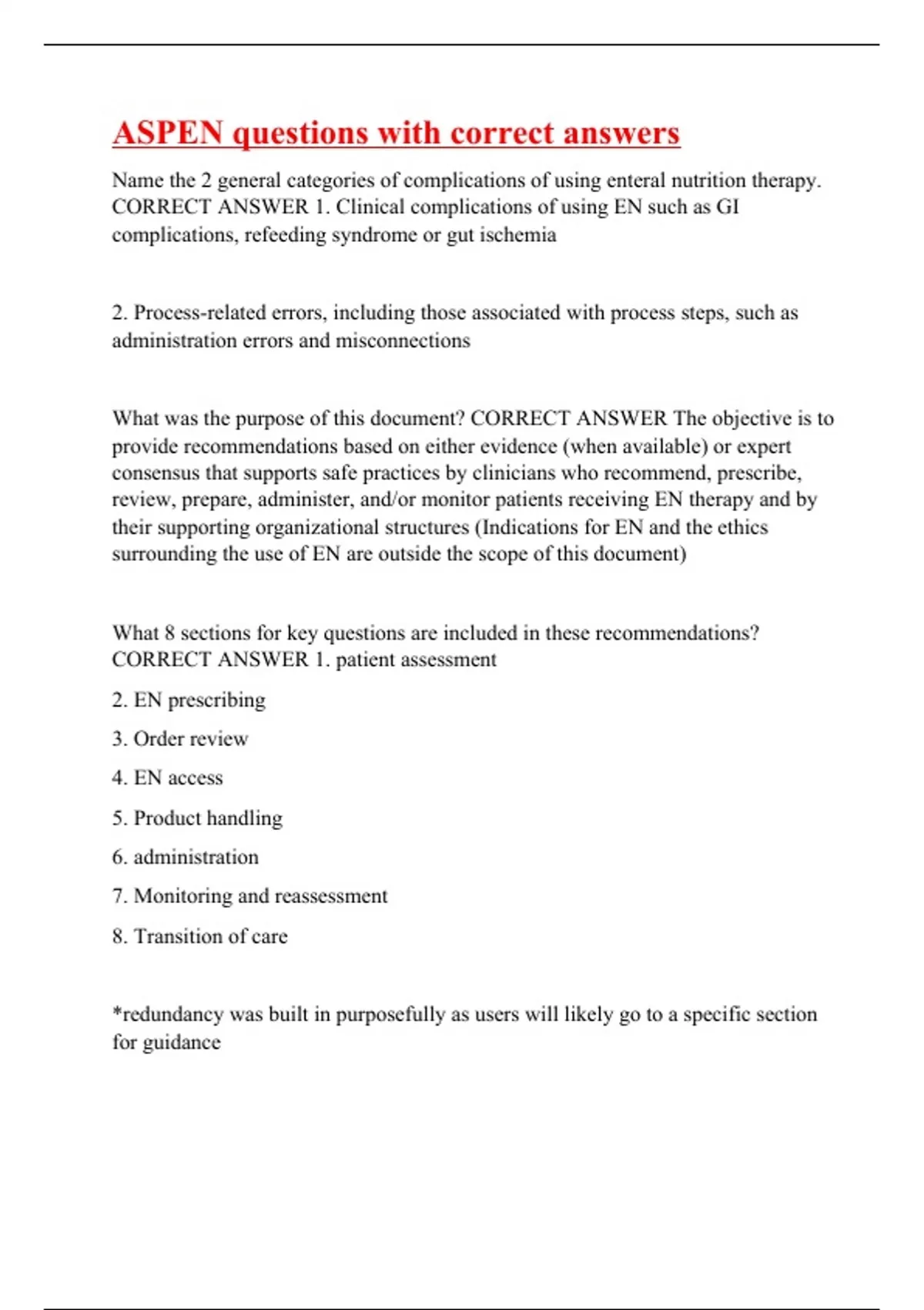 Name the 2 general categories of complications of using enteral nutrition therapy. CORRECT ANSWER 1. Clinical complications of using EN such as GI complications, refeeding syndrome or gut ischemia 2. Process-related errors, including those associated with process steps, such as administration errors and misconnections What was the purpose of this document? CORRECT ANSWER The objective is to provide recommendations based on either evidence (when available) or expert consensus that supports safe practices by clinicians who recommend, prescribe, review, prepare, administer, and/or monitor patients receiving EN therapy and by their supporting organizational structures (Indications for EN and the ethics surrounding the use of EN are outside the scope of this document) What 8 sections for key questions are included in these recommendations? CORRECT ANSWER 1. patient assessment 2. EN prescribing 3. Order review 4. EN access 5. Product handling 6. administration 7. Monitoring and reassessment 8. Transition of care