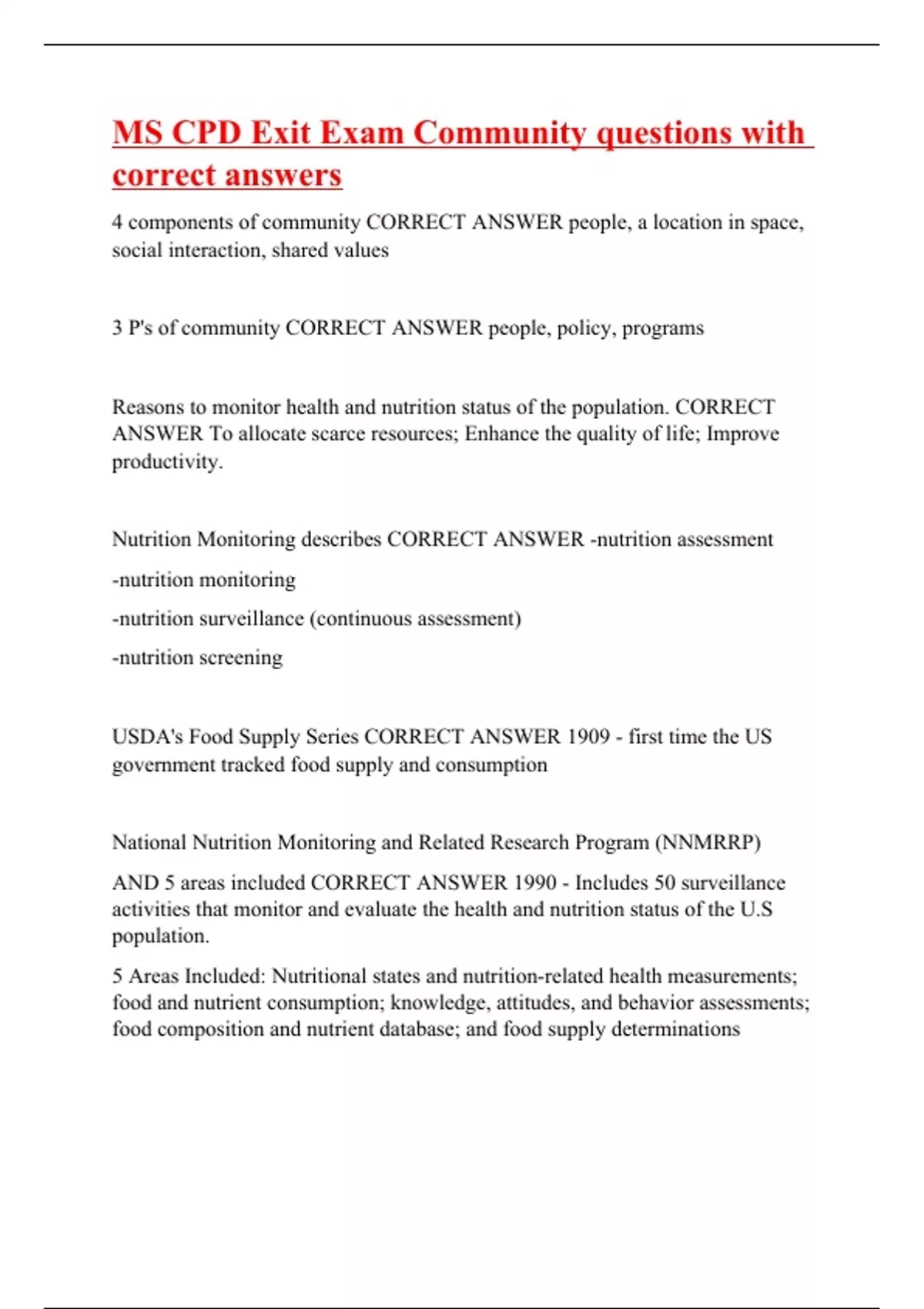 4 components of community CORRECT ANSWER people, a location in space, social interaction, shared values 3 P's of community CORRECT ANSWER people, policy, programs Reasons to monitor health and nutrition status of the population. CORRECT ANSWER To allocate scarce resources; Enhance the quality of life; Improve productivity. Nutrition Monitoring describes CORRECT ANSWER -nutrition assessment -nutrition monitoring -nutrition surveillance (continuous assessment) -nutrition screening USDA's Food Supply Series CORRECT ANSWER 1909 - first time the US government tracked food supply and consumption National Nutrition Monitoring and Related Research Program (NNMRRP) AND 5 areas included CORRECT ANSWER 1990 - Includes 50 surveillance activities that monitor and evaluate the health and nutrition status of the U.S population. 5 Areas Included: Nutritional states and nutrition-related health measurements; food and nutrient consumption; knowledge, attitudes, and behavior assessments; food composition and nutrient database; and food supply determinations