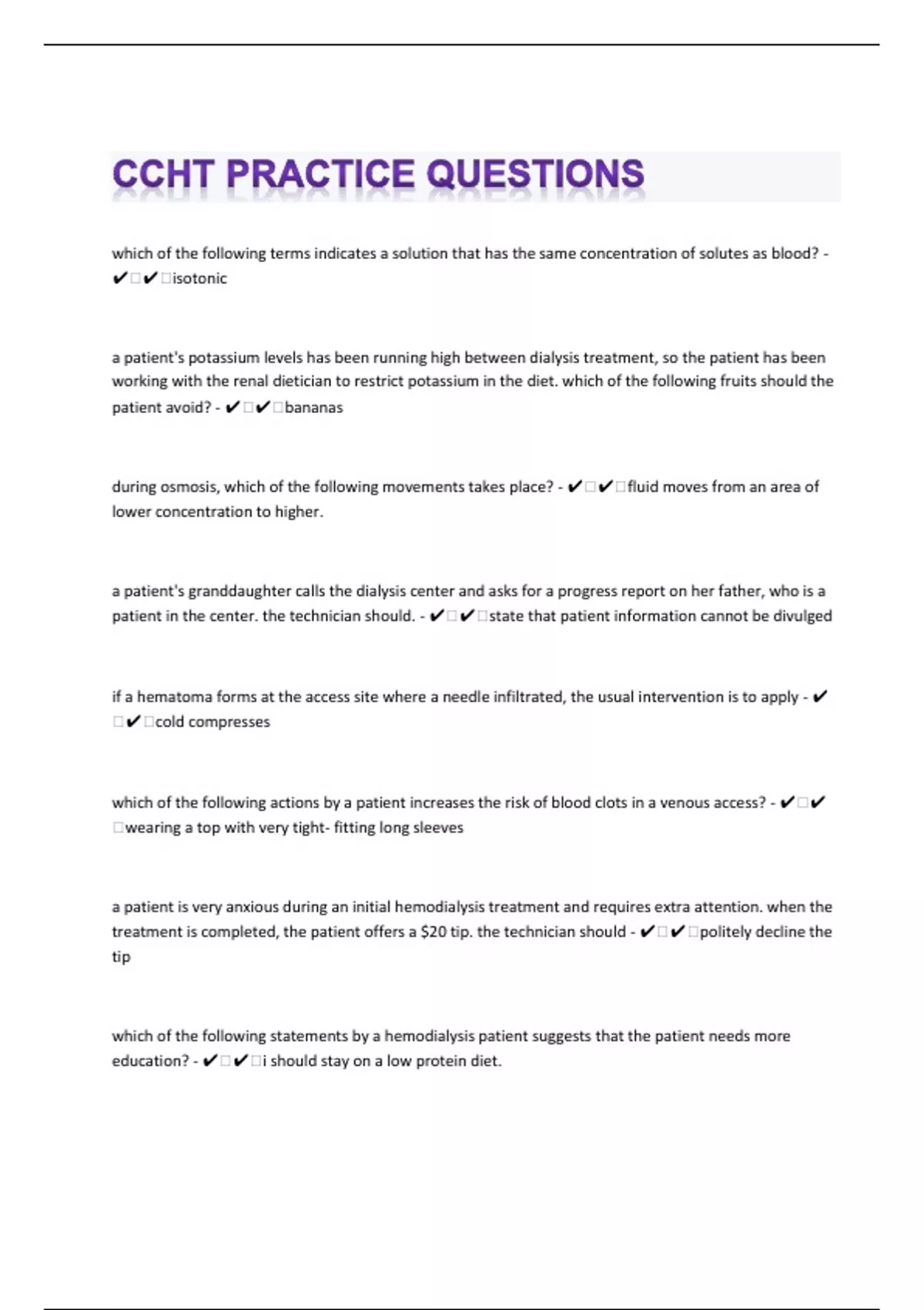 which of the following terms indicates a solution that has the same concentration of solutes as blood? - ️️isotonic a patient's potassium levels has been running high between dialysis treatment, so the patient has been working with the renal dietician to restrict potassium in the diet. which of the following fruits should the patient avoid? - ️️bananas during osmosis, which of the following movements takes place? - ️️fluid moves from an area of lower concentration to higher. a patient's granddaughter calls the dialysis center and asks for a progress report on her father, who is a patient in the center. the technician should. - ️️state that patient information cannot be divulged if a hematoma forms at the access site where a needle infiltrated, the usual intervention is to apply - ️️cold compresses which of the following actions by a patient increases the risk of blood clots in a venous access? - ️️wearing a top with very tight- fitting long sleeves a patient is very anxious during an initial hemodialysis treatment and requires extra attention. when the treatment is completed, the patient offers a $20 tip. the technician should - ️️politely decline the tip which of the following statements by a hemodialysis patient suggests that the patient needs more education? - ️️i should stay on a low protein diet.