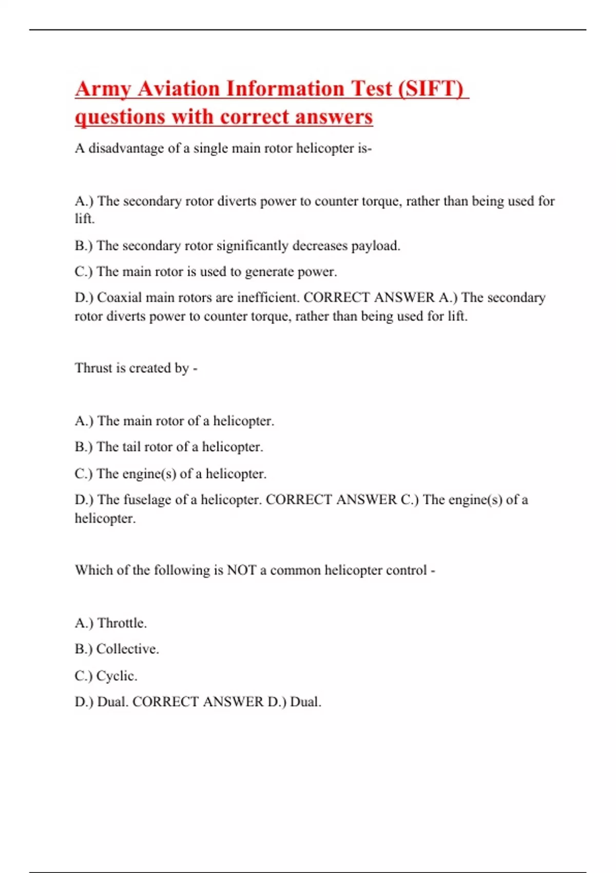 A disadvantage of a single main rotor helicopter is- A.) The secondary rotor diverts power to counter torque, rather than being used for lift. B.) The secondary rotor significantly decreases payload. C.) The main rotor is used to generate power. D.) Coaxial main rotors are inefficient. CORRECT ANSWER A.) The secondary rotor diverts power to counter torque, rather than being used for lift. Thrust is created by - A.) The main rotor of a helicopter. B.) The tail rotor of a helicopter. C.) The engine(s) of a helicopter. D.) The fuselage of a helicopter. CORRECT ANSWER C.) The engine(s) of a helicopter. Which of the following is NOT a common helicopter control -