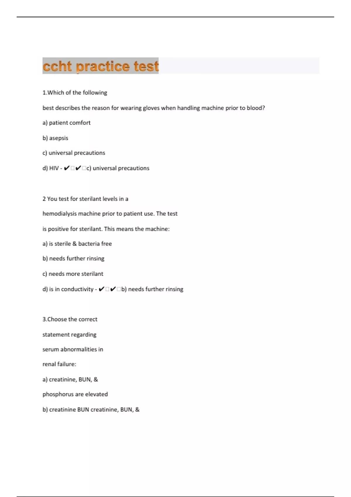 1.Which of the following best describes the reason for wearing gloves when handling machine prior to blood? a) patient comfort b) asepsis c) universal precautions d) HIV - ️️c) universal precautions 2 You test for sterilant levels in a hemodialysis machine prior to patient use. The test is positive for sterilant. This means the machine: a) is sterile & bacteria free b) needs further rinsing c) needs more sterilant d) is in conductivity - ️️b) needs further rinsing 3.Choose the correct statement regarding serum abnormalities in renal failure: a) creatinine, BUN, & phosphorus are elevated b) creatinine BUN creatinine, BUN, & phosphorus are depressed c) calcium & bicarbonate are elevated d) calcium & bicarbonate are depressed - ️️a) creatinine, BUN, & phosphorus are elevated