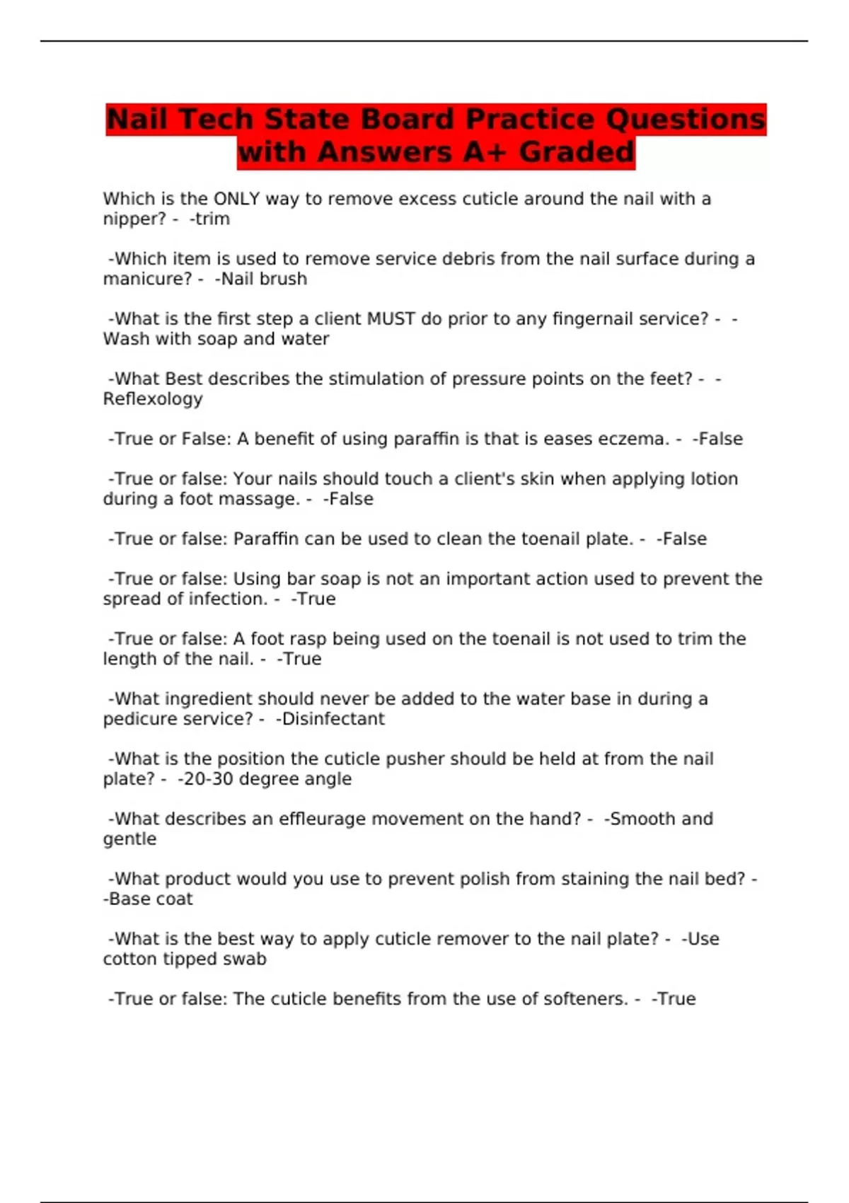 Nail Tech State Board Practice Questions with Answers A+ Graded