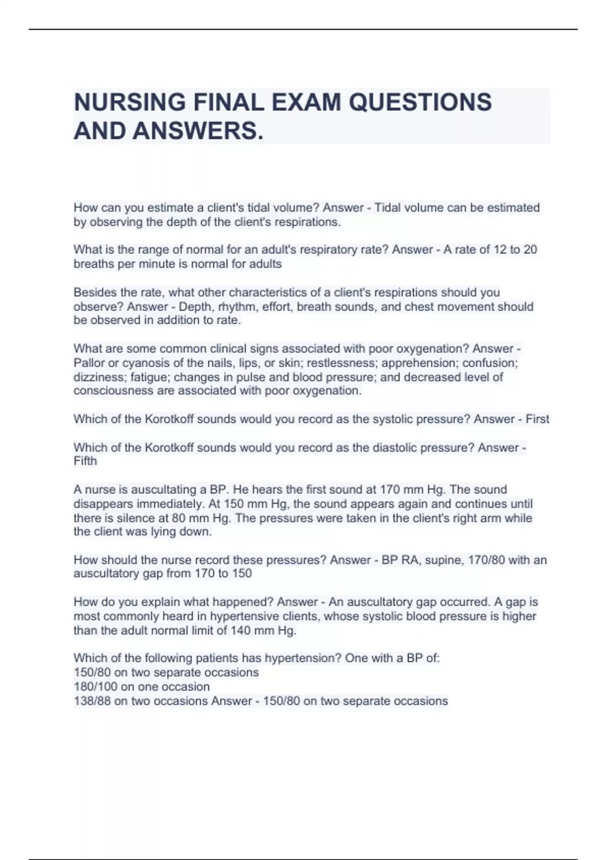 NURSING FINAL EXAM QUESTIONS AND ANSWERS.