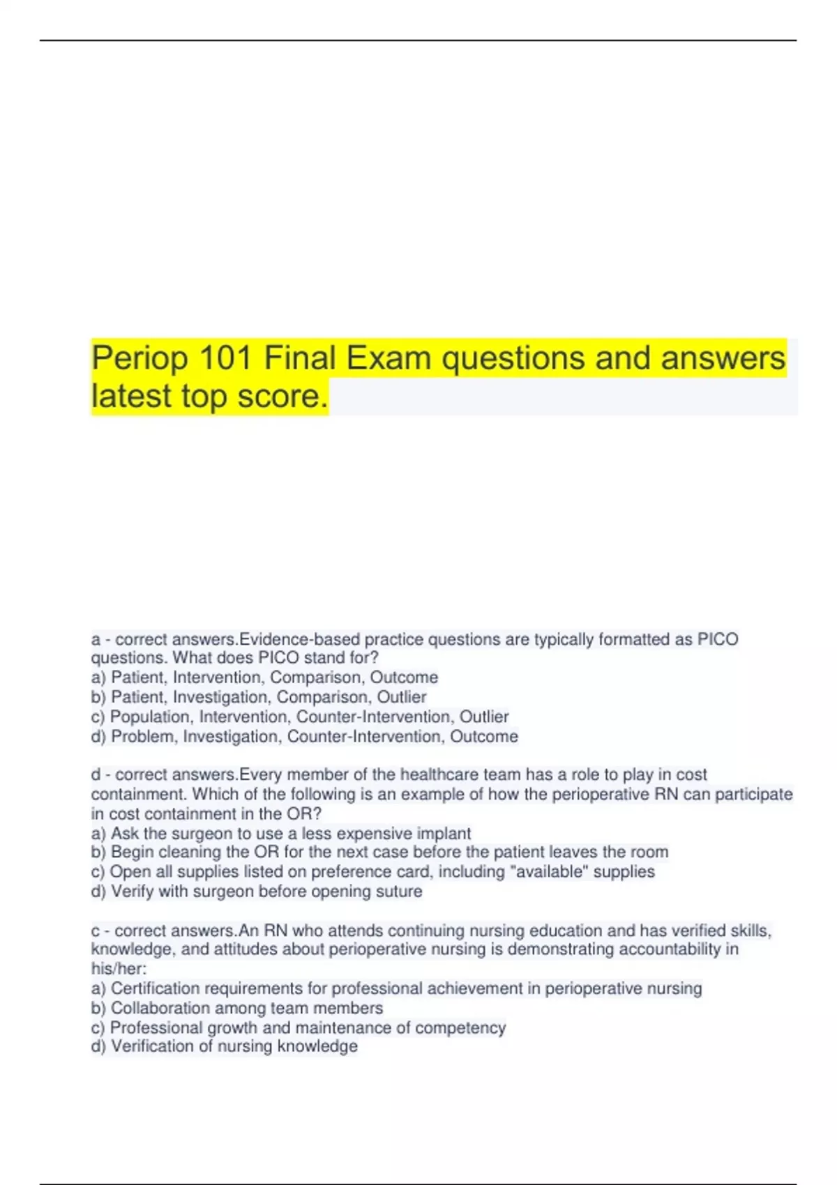 Periop 101 Final Exam questions and answers latest top score. a - correct answers.Evidence-based practice questions are typically formatted as PICO questions. What does PICO stand for? a) Patient, Intervention, Comparison, Outcome b) Patient, Investigation, Comparison, Outlier c) Population, Intervention, Counter-Intervention, Outlier d) Problem, Investigation, Counter-Intervention, Outcome d - correct answers.Every member of the healthcare team has a role to play in cost containment. Which of the following is an example of how the perioperative RN can participate in cost containment in the OR? a) Ask the surgeon to use a less expensive implant b) Begin cleaning the OR for the next case before the patient leaves the room c) Open all supplies listed on preference card, including "available" supplies d) Verify with surgeon before opening suture c - correct answers.An RN who attends continuing nursing education and has verified skills, knowledge, and attitudes about perioperative nursing is demonstrating accountability in his/her: a) Certification requirements for professional achievement in perioperative nursing b) Collaboration among team members c) Professional growth and maintenance of competency d) Verification of nursing knowledge d - correct answers.Which of the following statements is TRUE concerning use of the AORN Guidelines for Perioperative Practice? a) Both medical and nursing licensing boards require health care institutions to comply with the AORN guidelines b) The AORN Guidelines legally supersede departmental and institutional policies c) The AORN Guidelines reflect scientific evidence of how nurses actually practice in perioperative settings d) Work setting and situation variations may determine the extent to which AORN Guidelines can be applied c - correct answers.Which of the following is NOT an example of an ethical dilemma that perioperative nurses may encounter? a) Do-not-resuscitate (DNR) order for a surgical patient b) Family disagreement regardings possible organ donation c) Family disagreement about a below the knee amputation on an 18 year old who has already given consent d) Human experimentation b - correct answers.The phrase "At least one individual failed to do what a similarly situated, reasonable, and prudent professional would have done under similar circumstances" is the definition of: a) Abandonment b) Negligence c) Unethical behavior d) Malpractice d - correct answers.All of the following are accurate descriptions of "professional accountability" EXCEPT: a) Becoming certified in your specialty b) Collaborating with peers in selecting the right instruments and right equipment for each patient c) Pursuing a higher academic degree d) Relying ONLY on peer evaluations e) Staying current with changes in your specialty b - correct answers.Part of the AORN standards of Professional Practice mandate that nurses evaluate the quality of their nursing practice. Four ways to ensure professional practice related to the AORN practice include: maintaining competency, the use of evidence-based practice, certification, and: a) Mentoring student nurses b) Pursuit of lifelong learning c) Achieving a minimum of an associate's degree d) Achievement of an advanced practice nurse degree c - correct answers.After transferring a male patient into the Phase I PACU, the perioperative RN could reasonably expect the PACU RN to FIRST: a) Administer medication to the patient for nausea and vomiting b) Ask the patient is he has any pain c) Assess the patient's airway and respirations d) Care for this patient and two other patients as assigned b - correct answers.During a handover report to the PACU RN, the perioperative RN may use a communication method identified by the acronym "SBAR." What does SBAR stand for? a) Safety, Background, Actions, Recovery expectations b) Situation, Background, Assessment, Recommendation c) Safety concerns, Background, Assessment, Responsibility d) Surgeon, Background, Assessment, Recovery time c - correct answers.A 40-year-old male patient is awake and alert in the post anesthesia care unit after right shoulder surgery. What is the BEST measure to assess the patient's pain? a) Discuss the patient's pain with a close family member b) Observe facial expressions and behaviors c) Ask patient to describe his pain or use a standardized pain scale d) Monitor vital sign changes d - correct answers.What would be the MOST important information for a nurse in Preadmission Testing (PAT) to collect on an insulin dependent diabetic patient? a) How long the patient has been diabetic b) If there is someone to drive them home c) The last time the patient ate or drank d) The type of insulin the patient takes c - correct answers.The Perianesthesia nurse has ASPAN to guide their practice. What does ASPAN stand for? a) American Sterilization of PeriAnesthesia Nurses b) Association of Specialized PeriAnesthesia Nursing c) American Society of PeriAnesthesia Nursing d) Association of Surgical Post Anesthesia Nursing c - correct answers.You have completed your case and must now transport your patient to PACU. To give report to the PACU nurse, your facility requires that you provide report in SBAR, which stands for: a) Safety, Background, Actions, Recovery, Expectations b) Safety concerns, Background, Assessment, Responsibilities c) Situation, Background, Assessment, Recommendations d) Surgeon, Background, Assessment, Recovery time c - correct answers.You have just transferred your patient into the Phase I PACU. Which activities would you expect to observe FIRST? a) Administering medication for nausea and vomiting b) Asking patients if they have any pain c) Assessing patient airway and respirations d) Caring for patients in 1:3 ratio c - correct answers.A hand-over communication report is given by the anesthesia professional and the _________________? a) Surgical resident b) Medical student c) OR nurse d) Inpatient nurse c - correct answers.What should be included as part of the p