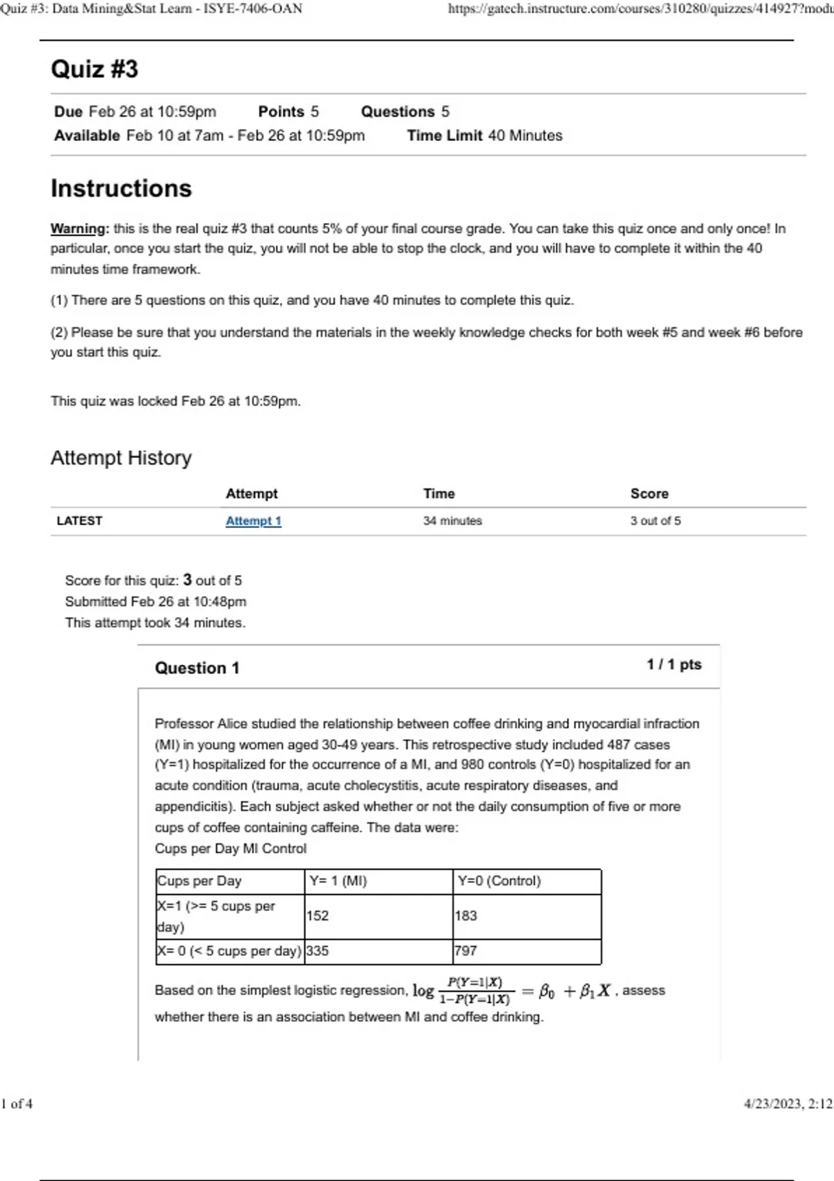 Quiz #3 Due Feb 26 at 10:59pm Points 5 Questions 5 Available Feb 10 at 7am - Feb 26 at 10:59pm Time Limit 40 Minutes Instructions This quiz was locked Feb 26 at 10:59pm. Attempt History Attempt Time Score LATEST Attempt 1 34 minutes 3 out of 5 Score for this quiz: 3 out of 5 Submitted Feb 26 at 10:48pm This attempt took 34 minutes. Warning: this is the real quiz #3 that counts 5% of your final course grade. You can take this quiz once and only once! In particular, once you start the quiz, you will not be able to stop the clock, and you will have to complete it within the 40 minutes time framework. (1) There are 5 questions on this quiz, and you have 40 minutes to complete this quiz. (2) Please be sure that you understand the materials in the weekly knowledge checks for both week #5 and week #6 before you start this quiz. Question 1 1 / 1 pts Professor Alice studied the relationship between coffee drinking and myocardial infraction (MI) in young women aged 30-49 years. This retrospective study included 487 cases (Y=1) hospitalized for the occurrence of a MI, and 980 controls (Y=0) hospitalized for an acute condition (trauma, acute cholecystitis, acute respiratory diseases, and appendicitis). Each subject asked whether or not the daily consumption of five or more cups of coffee containing caffeine. The data were: Cups per Day MI Control Cups per Day Y= 1 (MI) Y=0 (Control) X=1 (>= 5 cups p