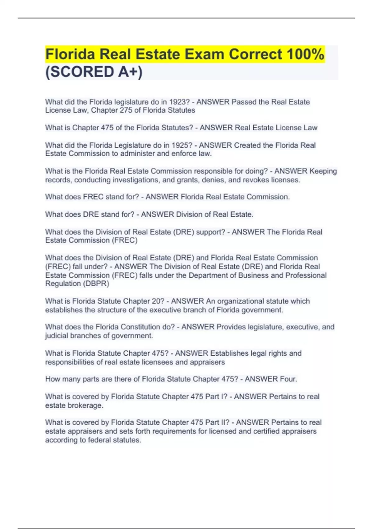 Florida Real Estate Exam Correct 100%(SCORED A+)