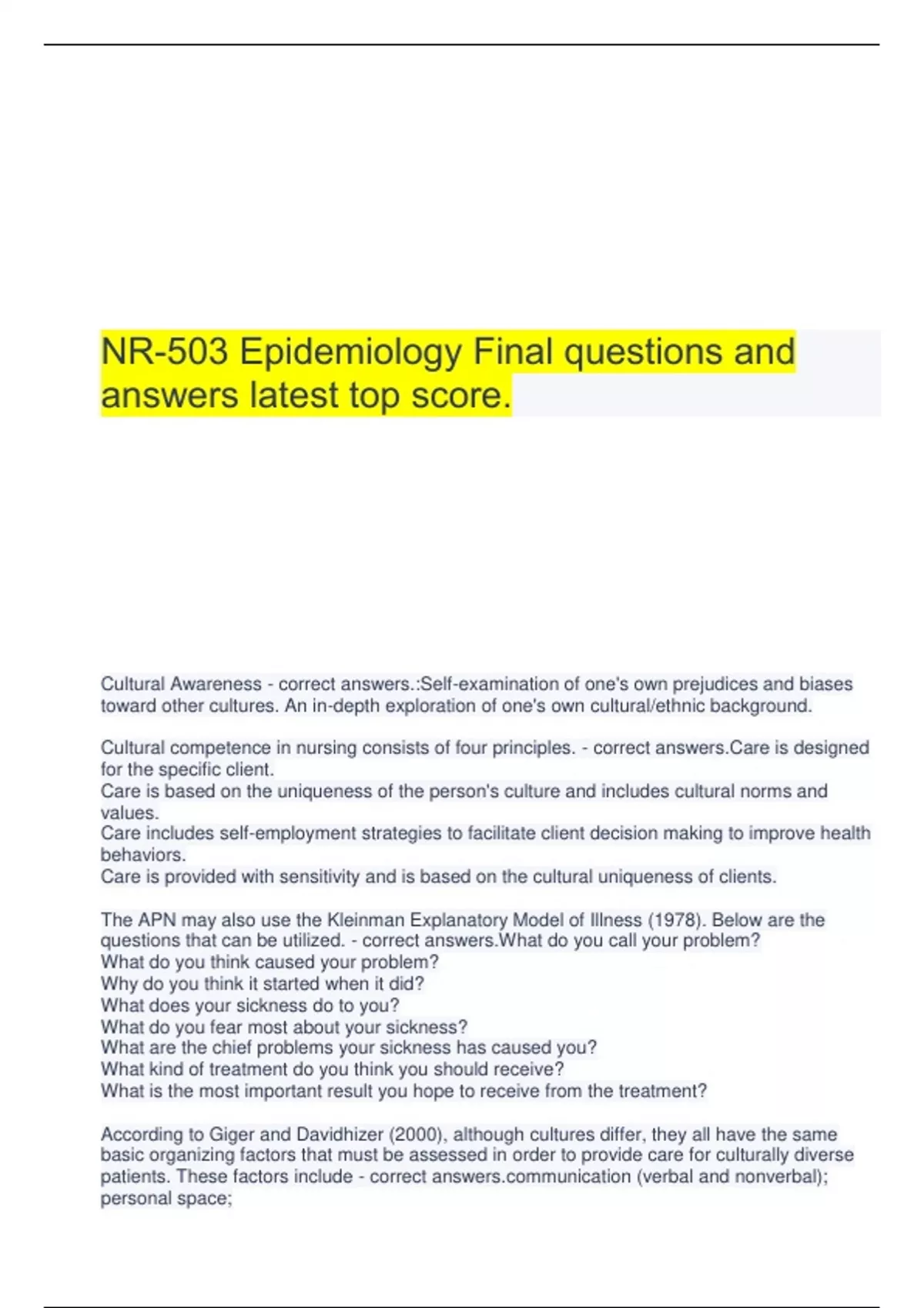 NR-503 Epidemiology Final questions and answers latest top score. Cultural Awareness - correct answers.:Self-examination of one's own prejudices and biases toward other cultures. An in-depth exploration of one's own cultural/ethnic background. Cultural competence in nursing consists of four principles. - correct answers.Care is designed for the specific client. Care is based on the uniqueness of the person's culture and includes cultural norms and values. Care includes self-employment strategies to facilitate client decision making to improve health behaviors. Care is provided with sensitivity and is based on the cultural uniqueness of clients. The APN may also use the Kleinman Explanatory Model of Illness (1978). Below are the questions that can be utilized. - correct answers.What do you call your problem? What do you think caused your problem? Why do you think it started when it did? What does your sickness do to you? What do you fear most about your sickness? What are the chief problems your sickness has caused you? What kind of treatment do you think you should receive? What is the most important result you hope to receive from the treatment? According to Giger and Davidhizer (2000), although cultures differ, they all have the same basic organizing factors that must be assessed in order to provide care for culturally diverse patients. These factors include - correct nication (verbal and nonverbal); personal space; social organization; time perception; environmental control; and biological variations. The NCCC uses four major approaches to fulfill its mission, including - correct answers.Web-based technical assistance, (2) knowledge development and dissemination, (3) supporting a community of learners, and (4) collaboration and partnerships with diverse groups. Epidemiological Triad: - correct , agent, environment Genetics - correct answers.The study of individual genes and their impact on relatively rare single gene disorders Absolute risk - correct the probability of an event, such as illness, injury, or death. Gives no indication of how its magnitude compares with others The odds ratio - correct ly approximates the relative risk if the disease is rare. Odds ratio and the relative risk are used - correct assess the strength of association between risk factor and outcome. How is Attributible risk used - correct used to make risk-based decisions for individuals. Population-attributable risk measures - correct used to form public health decisions EGAPP: - correct answers.Evaluation of Genomic Applications in Practice and Prevention GAPPNet - correct answers.Genomic Applications in Practice and Prevention Network (established in 2009) is a collaborative initiative involving partners from across the public health sector working together to realize the promise of genomics in health care and disease prevention. GEDDI - correct answers.Genetics Early Disease Detection Intervention project (GEDDI) (established in 2009) developed a model strategy for using clinical, genetic, and family history information to reduce the risk of disease, death, and disability in affected individuals, family members, and populations. HuGENet - correct answers.Human Genome Epidemiology Network (HuGENet) (established in 1998) helps translate genetic research findings into opportunities for preventive medicines and public health by advancing the synthesis, interpretation, and dissemination of population-based data on human genetic variation in health and disease. HuGENet reviews are systematic, peer-reviewed synopses of the epidemiologic aspects of human genes, including prevalence of allelic variants in different populations, population-based information on disease risk, evidence for gene-environment interaction and quantitative data on genetic tests and services carried out according to specific guidelines. NHANES III - correct answers.DC's Office of Public Health Genomics (established in 2002) formed a multidisciplinary working group with members from across CDC. It developed a proposal to measure the prevalence of selected genetic variants of public health significance in a representative sample of the U.S. population and to examine the association between the selected genetic variants and disease outcomes available in NHANES III data. The World Health Organization defines a pandemic - correct a global epidemic that spreads to more than one continent (WHO, 2009). One of the more recent pandemics that you might be familiar with is the H1N1 influenza outbreak of 2009. Outbreak - correct occurrence of disease within persons in excess of what would normally be expected in a clearly defined community, location, or time of year. An outbreak may only last for a matter of days or weeks, but may last for years Quarantine - correct separation and restriction of the movement of people who were or are exposed to a contagious disease for a set period of time, to see whether they become ill Antigenic drift - correct a term describing the changes that occur within virus's ribonucleic acid that changes the virus. Typically, these changes create seasonal changes or new strains of a virus WHO Pandemic Phases - correct answers.Phase 1—None of the current viruses circulating in animals have been reported to cause infection in humans. Phase 2—An animal-based influenza virus is known to have caused infection in humans and is considered a potential pandemic threat. Phase 3—An animal- or human-animal-based virus has caused some clusters of cases in people, but has not caused human-to-human transmission that is significant enough to cause community-level outbreaks. Phase 4—Human-to-human transmission of an animal or human-animal virus is causing community outbreaks and sustained disease. This is a significant shift in risk and any country with such an outbreak should consult with WHO. Phase 5—There is human-to-human spread of the virus in at least two countries. This phase means that pandemic is imminent and that community ac