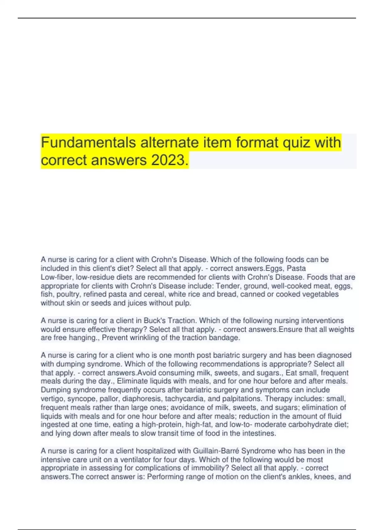 Fundamentals alternate item format quiz with correct answers 2023. A nurse is caring for a client with Crohn's Disease. Which of the following foods can be included in this client's diet? Select all that apply. - correct answers.Eggs, Pasta Low-fiber, low-residue diets are recommended for clients with Crohn's Disease. Foods that are appropriate for clients with Crohn's Disease include: Tender, ground, well-cooked meat, eggs, fish, poultry, refined pasta and cereal, white rice and bread, canned or cooked vegetables without skin or seeds and juices without pulp. A nurse is caring for a client in Buck's Traction. Which of the following nursing interventions would ensure effective therapy? Select all that apply. - correct answers.Ensure that all weights are free hanging., Prevent wrinkling of the traction bandage. A nurse is caring for a client who is one month post bariatric surgery and has been diagnosed with dumping syndrome. Which of the following recommendations is appropriate? Select all that apply. - correct answers.Avoid consuming milk, sweets, and sugars., Eat small, frequent meals during the day., Eliminate liquids with meals, and for one hour before and after meals. Dumping syndrome frequently occurs after bariatric surgery and symptoms can include vertigo, syncope, pallor, diaphoresis, tachycardia, and palpitations. Therapy includes: small, frequent meals rather than large ones; avoidance of milk, sweets, and sugars; elimination of liquids with meals and for one hour before and after meals; reduction in the amount of fluid ingested at one time, eating a high-protein, high-fat, and low-to- moderate carbohydrate diet; and lying down after meals to slow transit time of food in the intestines. A nurse is caring for a client hospitalized with Guillain-Barré Syndrome who has been in the intensive care unit on a ventilator for four days. Which of the following would be most appropriate in assessing for complications of immobility? Select all that apply. - correct answers.The correct answer is: Performing range of motion on the client's ankles, knees, and hips., Assess the character of bowel sounds and frequency of stools., Observe skin color over sacral, heels, and scapulae areas. Potential complications of immobility could include the following: loss of joint motion and contractures, decreased gastrointestinal motility and constipation, deep vein thrombosis with erythema and swelling of the calf areas, and skin breakdown with early evidence of pallor, erythema, blistering over bony prominences. An 87-year-old client has been admitted repeatedly to the acute care setting for pneumonia. The client's family asks what measures can help prevent recurrent respiratory issues. Which of the following measures should the nurse discuss to prevent respiratory issues? Select all that apply. - correct answers.Ambulate the client regularly, daily., Use a humidifier to moisten the air in the client's room, when needed., Reassure the client during respiratory distress. Encourage structured activities, after learning the client's physical capabilities and provide rest periods to prevent dyspnea. Using a humidifier during drier seasons can help prevent secretions from becoming thick and difficult to expectorate. If a client is having difficulty breathing, the caregiver(s) should provide support and reassurance to decrease the client's anxiety. A nurse is assisting a client with an advance directive. Which of the following nursing responsibilities should be included regarding advance directives? Select all that apply. - correct answers.: Confirm that the advance directive is current., Document the client's advance directive in the medical chart., Provide written information to the client about advance directives. The nursing responsibility regarding advance directives is to ensure that the advance directive is current and reflective of the client's current decisions. Which of the following client care assignments is appropriate for the nurse to delegate to unlicensed assistive personnel (UAP)? Select all that apply. - correct answers.Obtain vital signs every 4 hours for a client with ulcerative colitis., Assist a client with a new transurethral prostectomy with perineal care., Transport a client who is utilizing oxygen and has a peripheral IV catheter. Assisting followers in identifying situations appropriate for delegation is considered an effective leadership function. Assisting followers to use delegation as a time management strategy and team-building tool is considered an effective leadership function. Functioning as a role model, supporter, and resource person in delegating tasks to subordinates are leadership functions that are associated with delegation. A nurse is managing client care. Which of the following should be implemented when prioritizing care? Select all that apply. - correct answers.: Prepare a written list., Postpone items that do not have immediate deadlines. Preparing a written list is a function considered in prioritizing client care. Items that are marked as to do later reflect trivial problems or those that do not have immediate deadlines; thus, they may be postponed when prioritizing care. An older adult client with a history of heart failure is admitted to the hospital with a diagnosis of digoxin toxicity. Which of the following assessment findings should the nurse expect? Select all at apply. - correct answers.Digoxin level 1.5 ng/ml, Heart rate of 52 bpm, Yellow vision