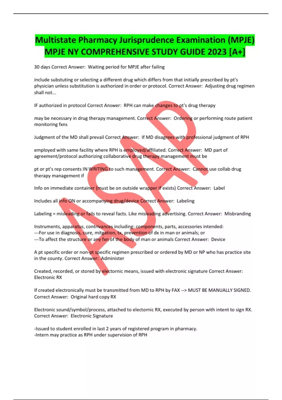 Multistate Pharmacy Jurisprudence Examination (MPJE) MPJE NY COMPREHENSIVE STUDY GUIDE 2023 [A+] 30 days Correct Answer: Waiting period for MPJE after failing include substuting or selecting a different drug which differs from that initially prescribed by pt's physician unless substitution is authorized in order or protocol. Correct Answer: Adjusting drug regimen shall not... IF authorized in protocol Correct Answer: RPH can make changes to pt's drug therapy may be necessary in drug therapy management. Correct Answer: Ordering or performing route patient monitoring fxns Judgment of the MD shall prevail Correct Answer: If MD disagrees with professional judgment of RPH employed with same facility where RPH is employed/affiliated. Correct Answer: MD part of agreement/protocol authorizing collaborative drug therapy management must be pt or pt's rep consents IN WRITING to such management. Correct Answer: Cannot use collab drug therapy management if Info on immediate container (must be on outside wrapper if exists) Correct Answer: Label Includes all info ON or accompanying drug/device Correct Answer: Labeling Labeling = misleading or fails to reveal facts. Like misleading advertising. Correct Answer: Misbranding Instruments, apparatus, contrivances including: components, parts, accessories intended: ---For use in diagnosis, cure, mitgation, tx, prevention of dx in man or animals; or ---To affect the structure or any fxn of the body of man or animals Correct Answer: Device A pt specific order or non-pt specific regimen prescribed or ordered by MD or NP who has practice site in the county. Correct Answer: Administer Created, recorded, or stored by electornic means, issued with electronic signature Correct Answer: Electronic RX If created electronically must be transmitted from MD to RPH by FAX --> MUST BE MANUALLY SIGNED. Correct Answer: Original hard copy RX Electronic sound/symbol/process, attached to electornic RX, executed by person with intent to sign RX. Correct Answer: Electronic Signature -Issued to student enrolled in last 2 years of registered program in pharmacy. -Intern may practice as RPH under supervision of RPH