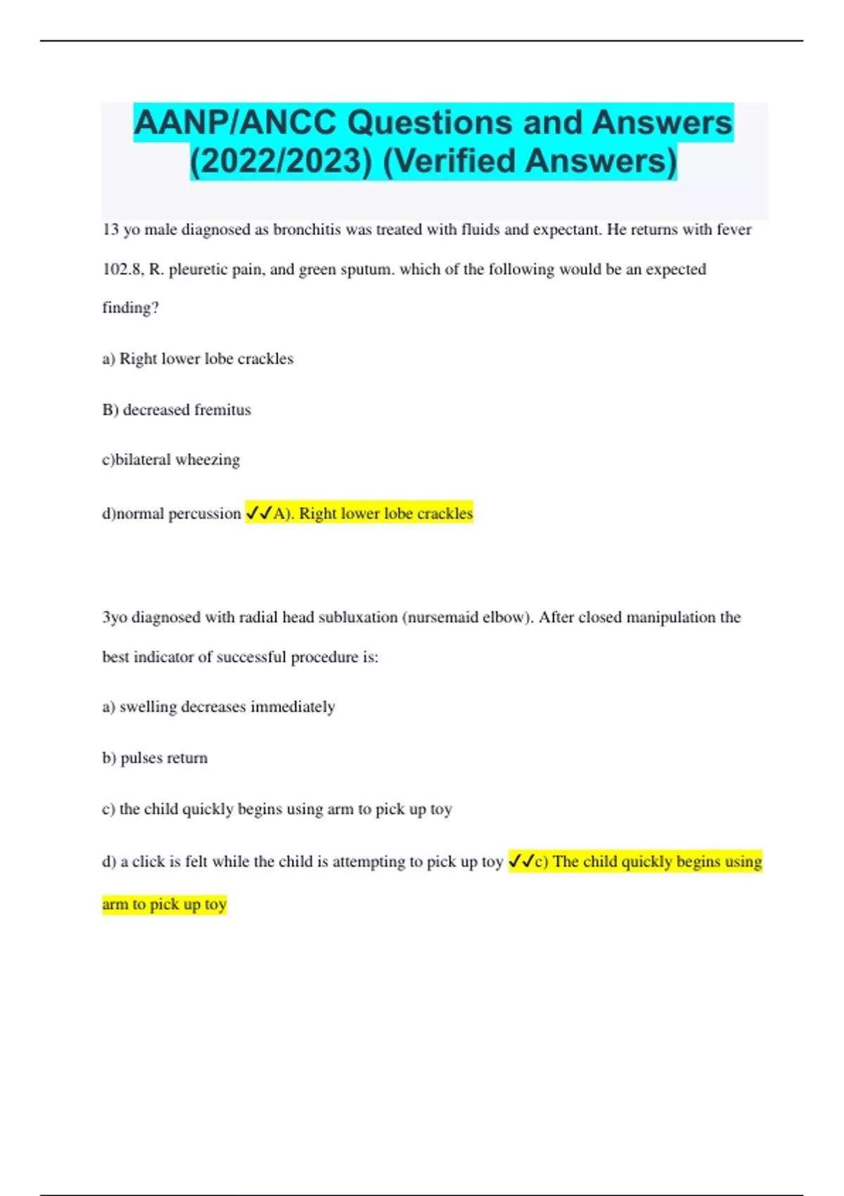 13 yo male diagnosed as bronchitis was treated with fluids and expectant. He returns with fever 102.8, R. pleuretic pain, and green sputum. which of the following would be an expected finding? a) Right lower lobe crackles B) decreased fremitus c)bilateral wheezing d)normal percussion A). Right lower lobe crackles 3yo diagnosed with radial head subluxation (nursemaid elbow). After closed manipulation the best indicator of successful procedure is: a) swelling decreases immediately b) pulses return c) the child quickly begins using arm to pick up toy d) a click is felt while the child is attempting to pick up toy c) The child quickly begins using arm to pick up toy