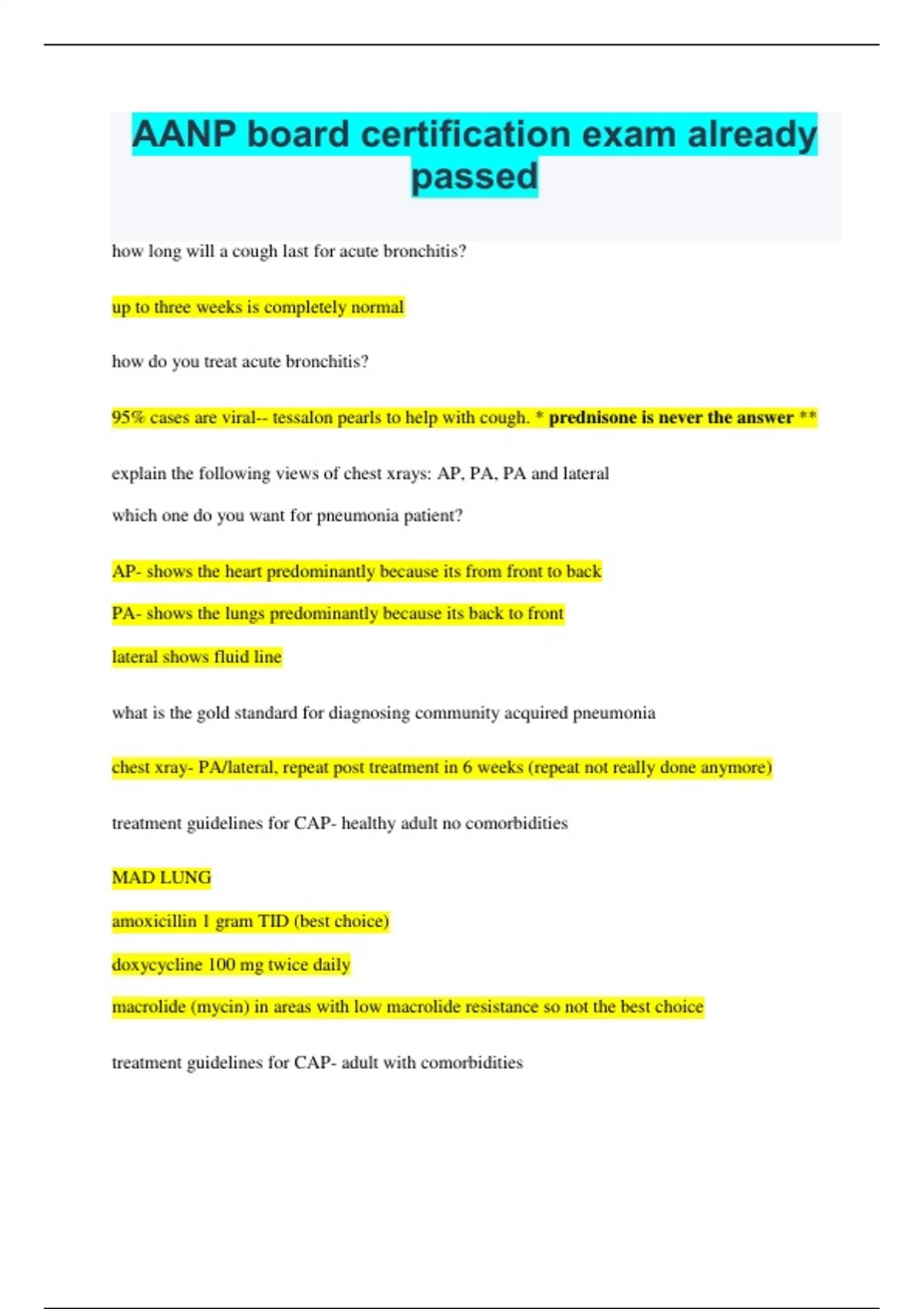 how long will a cough last for acute bronchitis? up to three weeks is completely normal how do you treat acute bronchitis? 95% cases are viral-- tessalon pearls to help with cough. * prednisone is never the answer ** explain the following views of chest xrays: AP, PA, PA and lateral which one do you want for pneumonia patient? AP- shows the heart predominantly because its from front to back PA- shows the lungs predominantly because its back to front lateral shows fluid line what is the gold standard for diagnosing community acquired pneumonia chest xray- PA/lateral, repeat post treatment in 6 weeks (repeat not really done anymore) treatment guidelines for CAP- healthy adult no comorbidities MAD LUNG amoxicillin 1 gram TID (best choice) doxycycline 100 mg twice daily macrolide (mycin) in areas with low macrolide resistance so not the best choice treatment guidelines for CAP- adult with comorbidities