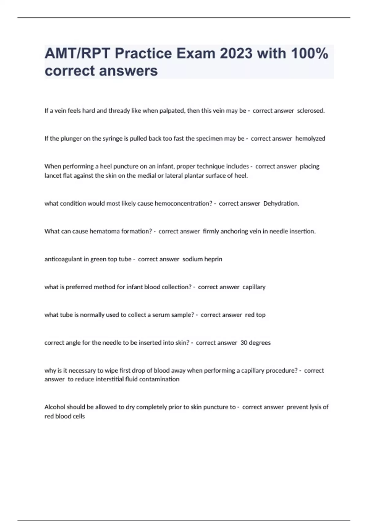 If a vein feels hard and thready like when palpated, then this vein may be - correct answer sclerosed. If the plunger on the syringe is pulled back too fast the specimen may be - correct answer hemolyzed When performing a heel puncture on an infant, proper technique includes - correct answer placing lancet flat against the skin on the medial or lateral plantar surface of heel. what condition would most likely cause hemoconcentration? - correct answer Dehydration. What can cause hematoma formation? - correct answer firmly anchoring vein in needle insertion. anticoagulant in green top tube - correct answer sodium heprin what is preferred method for infant blood collection? - correct answer capillary what tube is normally used to collect a serum sample? - correct answer red top correct angle for the needle to be inserted into skin? - correct answer 30 degrees why is it necessary to wipe first drop of blood away when performing a capillary procedure? - correct answer to reduce interstitial fluid contamination Alcohol should be allowed to dry completely prior to skin puncture to - correct answer prevent lysis of red blood cells the phlebotomist places blood specimen in circles on special filter paper, for what test? - correct answer PKU A falsely decreased blood alcohol level may be obtained if - correct answer the tube is only partially filled Following venipuncture, what should be applied to venipuncture site? - correct answer clean sterile gauze pad