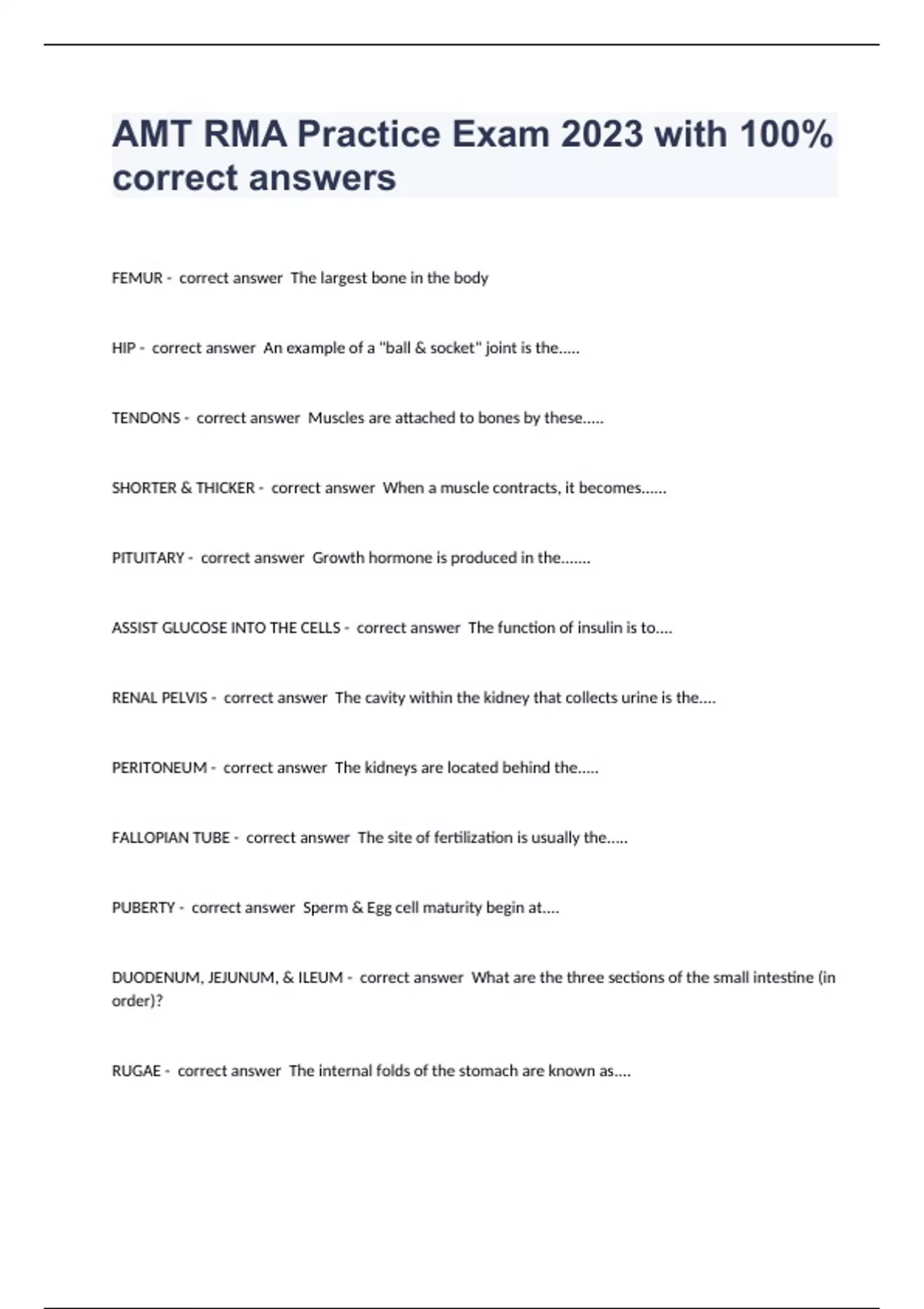 FEMUR - correct answer The largest bone in the body HIP - correct answer An example of a "ball & socket" joint is the..... TENDONS - correct answer Muscles are attached to bones by these..... SHORTER & THICKER - correct answer When a muscle contracts, it becomes...... PITUITARY - correct answer Growth hormone is produced in the....... ASSIST GLUCOSE INTO THE CELLS - correct answer The function of insulin is to.... RENAL PELVIS - correct answer The cavity within the kidney that collects urine is the.... PERITONEUM - correct answer The kidneys are located behind the..... FALLOPIAN TUBE - correct answer The site of fertilization is usually the..... PUBERTY - correct answer Sperm & Egg cell maturity begin at.... DUODENUM, JEJUNUM, & ILEUM - correct answer What are the three sections of the small intestine (in order)? RUGAE - correct answer The internal folds of the stomach are known as....