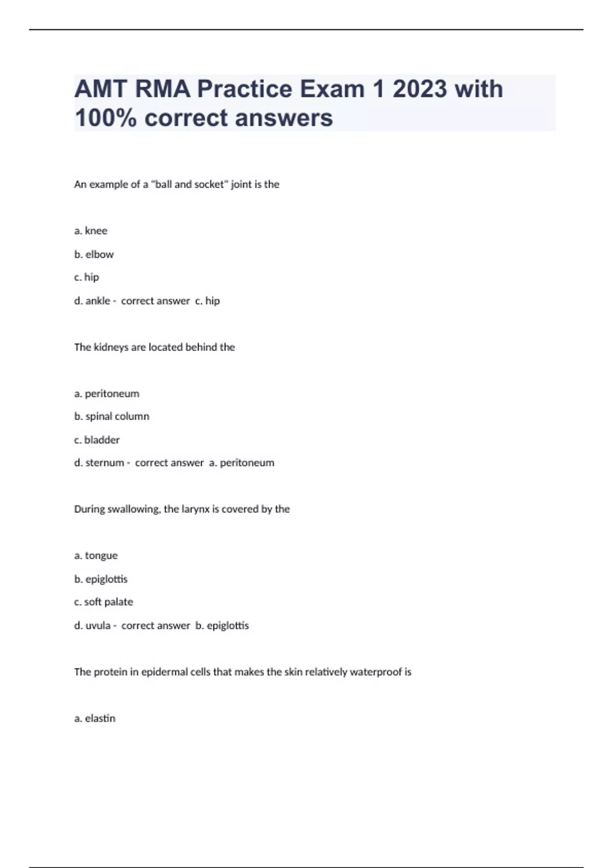 An example of a "ball and socket" joint is the a. knee b. elbow c. hip d. ankle - correct answer c. hip The kidneys are located behind the a. peritoneum b. spinal column c. bladder d. sternum - correct answer a. peritoneum During swallowing, the larynx is covered by the a. tongue b. epiglottis c. soft palate d. uvula - correct answer b. epiglottis The protein in epidermal cells that makes the skin relatively waterproof is a. elastin b. keratin c. melanin d. collag