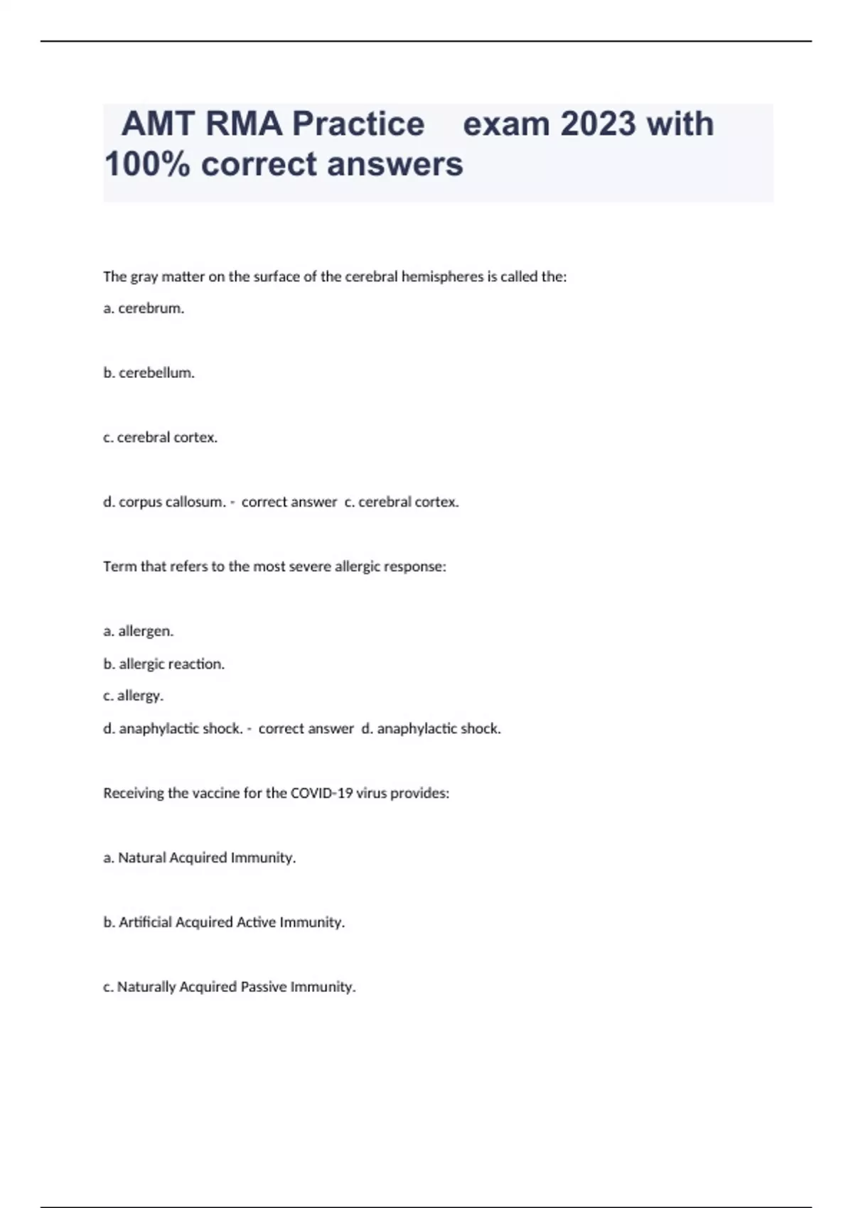 The gray matter on the surface of the cerebral hemispheres is called the: a. cerebrum. b. cerebellum. c. cerebral cortex. d. corpus callosum. - correct answer c. cerebral cortex. Term that refers to the most severe allergic response: a. allergen. b. allergic reaction. c. allergy. d. anaphylactic shock. - correct answer d. anaphylactic shock. Receiving the vaccine for the COVID-19 virus provides: a. Natural Acquired Immunity. b. Artificial Acquired Active Immunity. c. Naturally Acquired Passive Immunity. d. Artificially Acquired Passive Immunity. - correct answer b. Artificial Acquired Active Immunity. The outermost of the pericardial membranes is the: a. epica
