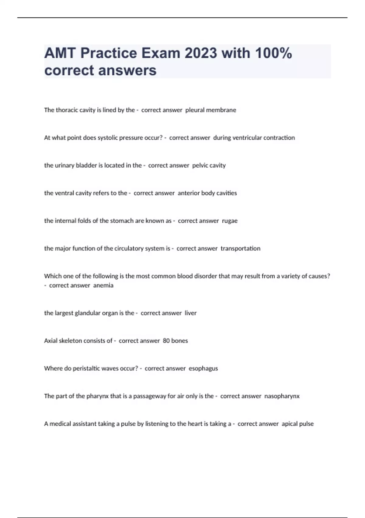 The thoracic cavity is lined by the - correct answer pleural membrane At what point does systolic pressure occur? - correct answer during ventricular contraction the urinary bladder is located in the - correct answer pelvic cavity the ventral cavity refers to the - correct answer anterior body cavities the internal folds of the stomach are known as - correct answer rugae the major function of the circulatory system is - correct answer transportation Which one of the following is the most common blood disorder that may result from a variety of causes? - correct answer anemia the largest glandular organ is the - correct answer liver Axial skeleton consists of - correct answer 80 bones Where do peristaltic waves occur? - correct answer esophagus The part of the pharynx that is a passageway for air only is the - correct answer nasopharynx A medical assistant taking a pulse by listening to the heart is taking a - correct answer apical pulse Muscles are
