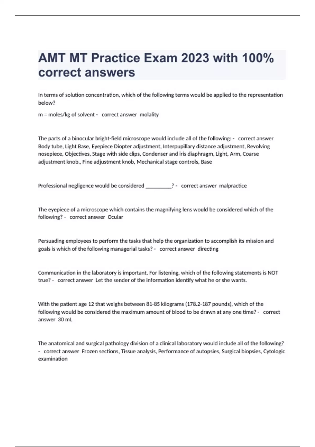 In terms of solution concentration, which of the following terms would be applied to the representation below? m = moles/kg of solvent - correct answer molality The parts of a binocular bright-field microscope would include all of the following: - correct answer Body tube, Light Base, Eyepiece Diopter adjustment, Interpupillary distance adjustment, Revolving nosepiece, Objectives, Stage with side clips, Condenser and iris diaphragm, Light, Arm, Coarse adjustment knob,, Fine adjustment knob, Mechanical stage controls, Base Professional negligence would be considered _________? - correct answer malpractice The eyepiece of a microscope which contains the magnifying lens would be considered which of the following? - correct answer Ocular Persuading employees to perform the tasks that help the organization to accomplish its mission and goals is which of the following managerial tasks? - correct answer directing Communication in the laboratory is important. For listening, which of the following statements is NOT true? - correct answer Let the sender of the information identify what he or she wants. With the patient age 12 that weighs between 81-85 kilograms (178.2-187 pounds), which of the following would be considered the maximum amount of blood to be drawn at any one time? - correct answer 30 mL The anatomical and surgical pathology division of a clinical laboratory would include all of the following? - correct answer Frozen sections, Tissue analysis, Performance of autopsies, Surgical biopsies, Cytologic examination there are