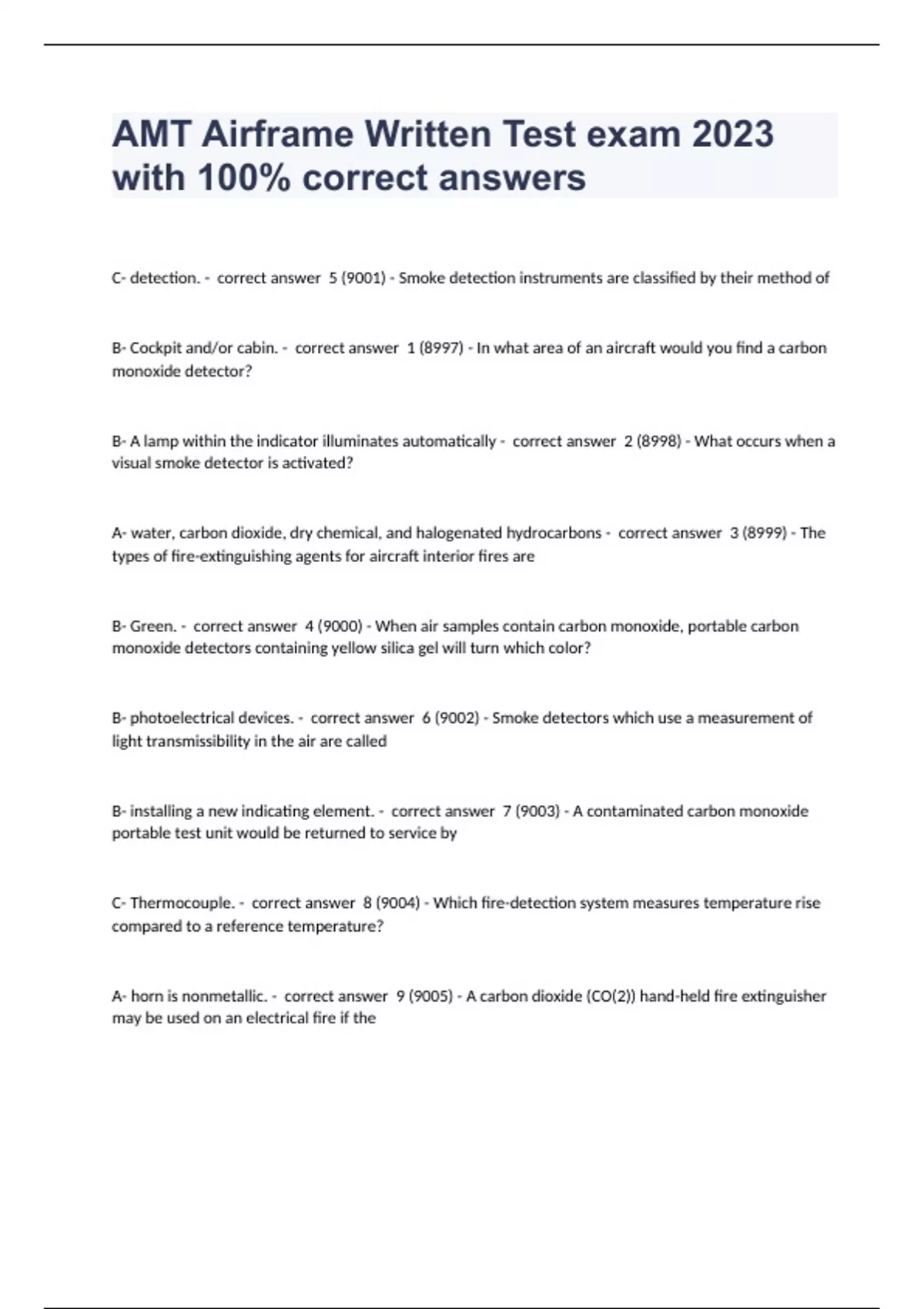 C- detection. - correct answer 5 (9001) - Smoke detection instruments are classified by their method of B- Cockpit and/or cabin. - correct answer 1 (8997) - In what area of an aircraft would you find a carbon monoxide detector? B- A lamp within the indicator illuminates automatically - correct answer 2 (8998) - What occurs when a visual smoke detector is activated? A- water, carbon dioxide, dry chemical, and halogenated hydrocarbons - correct answer 3 (8999) - The types of fire-extinguishing agents for aircraft interior fires are B- Green. - correct answer 4 (9000) - When air samples contain carbon monoxide, portable carbon monoxide detectors containing yellow silica gel will turn which color? B- photoelectrical devices. - correct answer 6 (9002) - Smoke detectors which use a measurement of light transmissibility in the air are called B- installing a new indicating element. - correct answer 7 (9003) - A contaminated carbon monoxide portable test unit would be returned to service by C- Thermocouple. - correct answer 8 (9004) - Which fire-detection system measures temperature rise compared to a reference temperature? A- horn is n