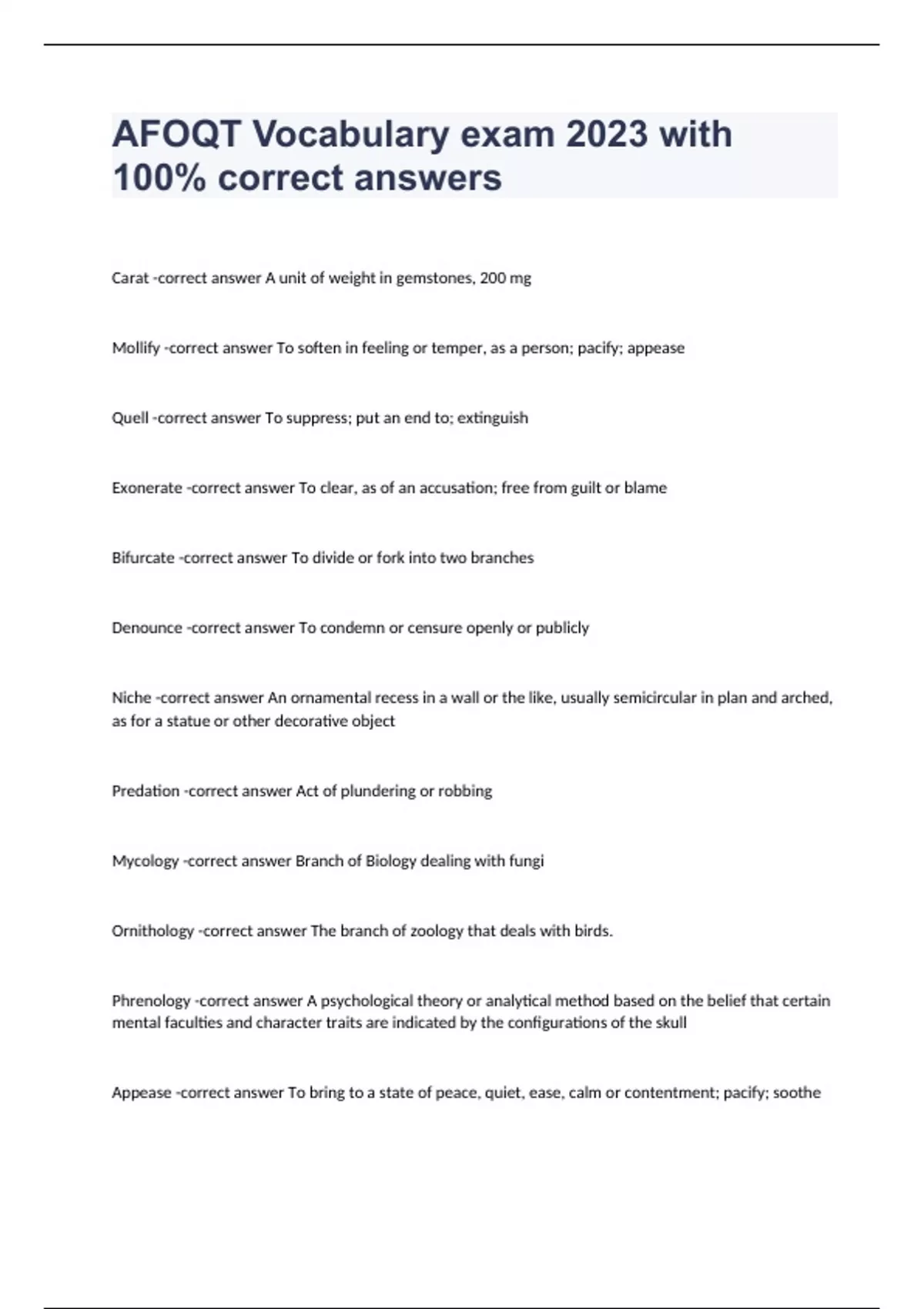 Carat -correct answer A unit of weight in gemstones, 200 mg Mollify -correct answer To soften in feeling or temper, as a person; pacify; appease Quell -correct answer To suppress; put an end to; extinguish Exonerate -correct answer To clear, as of an accusation; free from guilt or blame Bifurcate -correct answer To divide or fork into two branches Denounce -correct answer To condemn or censure openly or publicly Niche -correct answer An ornamental recess in a wall or the like, usually semicircular in plan and arched, as for a statue or other decorative object Predation -correct answer Act of plundering or robbing Mycology -correct answer Branch of Biology dealing with fungi Ornithology -correct answer The branch of zoology that deals with birds. Phrenology -correct answer A psychological theory or analytical method based on the belief that certain mental faculties and character traits are indicated by the configurations of the skull Appeas