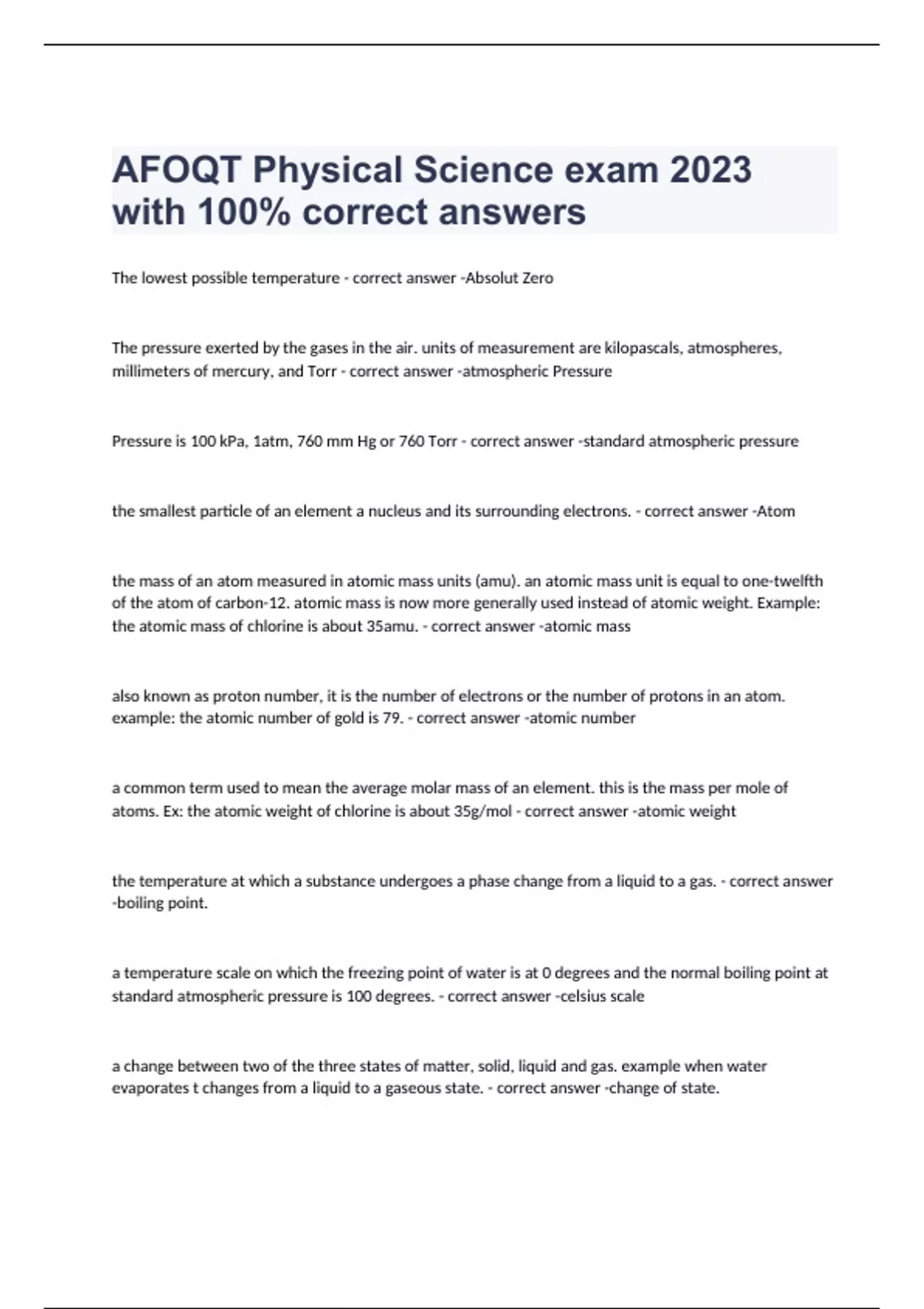 The lowest possible temperature - correct answer -Absolut Zero The pressure exerted by the gases in the air. units of measurement are kilopascals, atmospheres, millimeters of mercury, and Torr - correct answer -atmospheric Pressure Pressure is 100 kPa, 1atm, 760 mm Hg or 760 Torr - correct answer -standard atmospheric pressure the smallest particle of an element a nucleus and its surrounding electrons. - correct answer -Atom the mass of an atom measured in atomic mass units (amu). an atomic mass unit is equal to one-twelfth of the atom of carbon-12. atomic mass is now more generally used instead of atomic weight. Example: the atomic mass of chlorine is about 35amu. - correct answer -atomic mass also known as proton number, it is the number of electrons or the number of protons in an atom. example: the atomic number of gold is 79. - correct answer -atomic number a common term used to mean the average molar mass of an element. this is the mass per mole of atoms. Ex: the atomic weight of chlorine is about 35g/mol - correct answer -atomic weight the temperature at which a substance undergoes a phase change from a liquid to a gas. - correct answer -boiling point. a temperature scale on which the freezing point of water is at 0 degrees and the normal boiling point at standard atmospheric pressure is 100 degrees. - correct answer -celsius scale